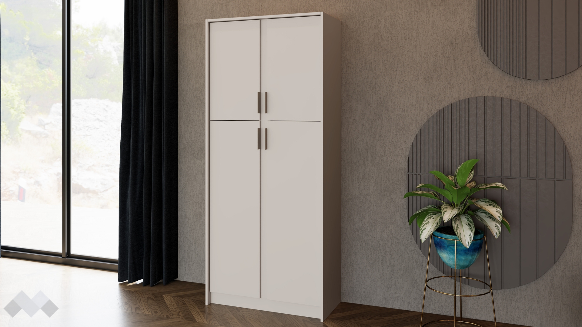 ⭐ Предимства: ✓ висок шкаф с 4 врати ✓ 4 вътрешни рафта ✓ механизъм за плавно затваряне ✓ модерен декор ✓ качествена изработка ✓ 16 мм ПДЧ