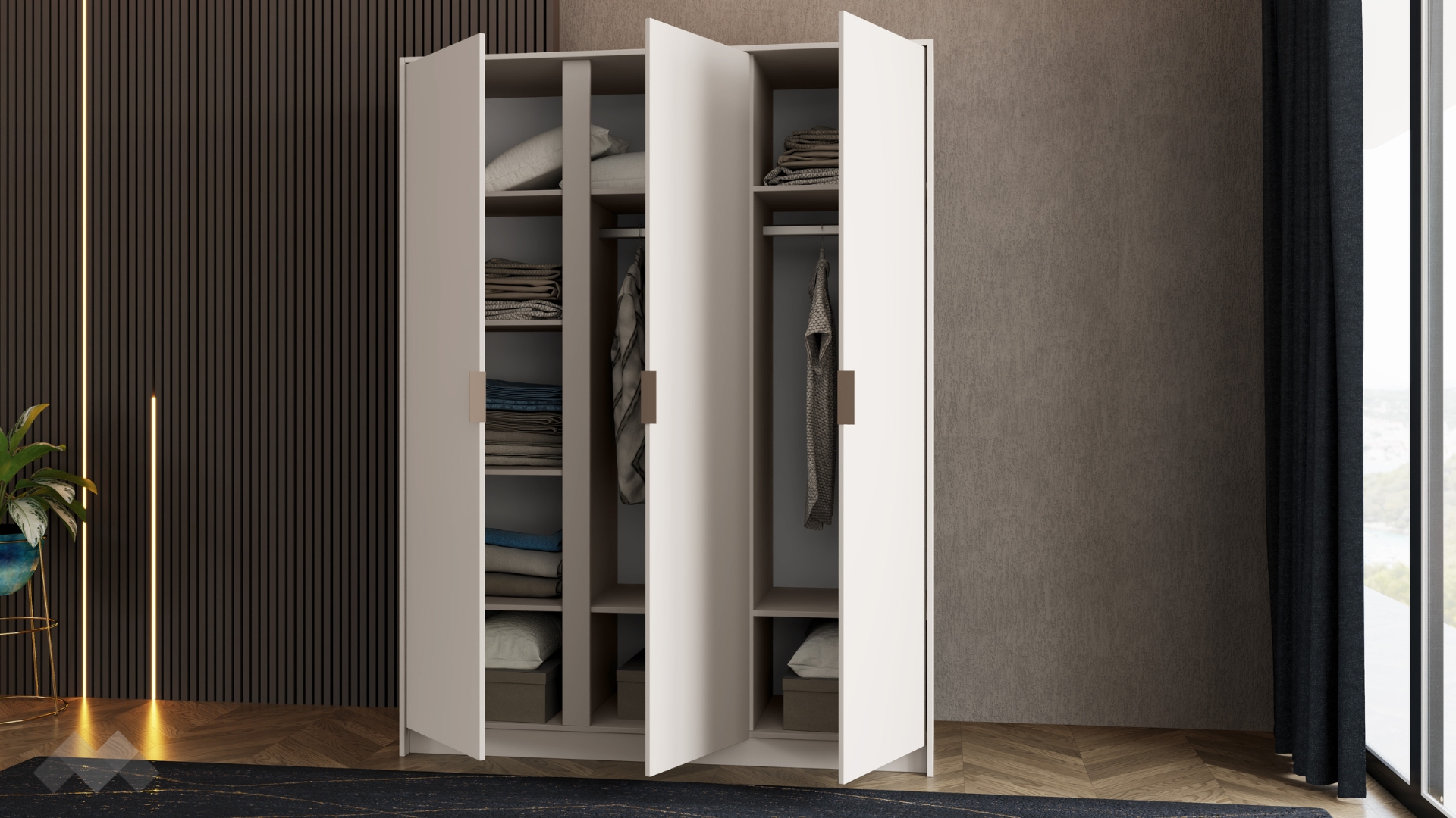 Трикрилният гардероб Кашмир е отлично решение за домове, в които организацията и удобството са на първо място. Благодарение на добре обмисленото вътрешно разпределение, той осигурява изобилие от пространство за всякакъв тип дрехи и аксесоари.