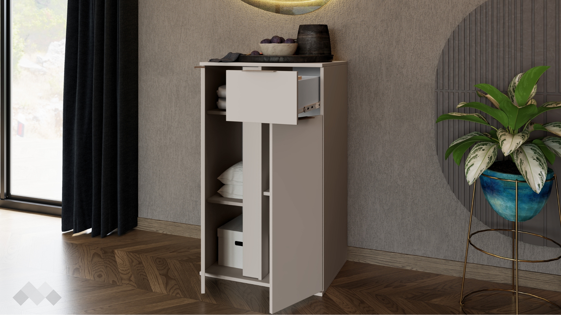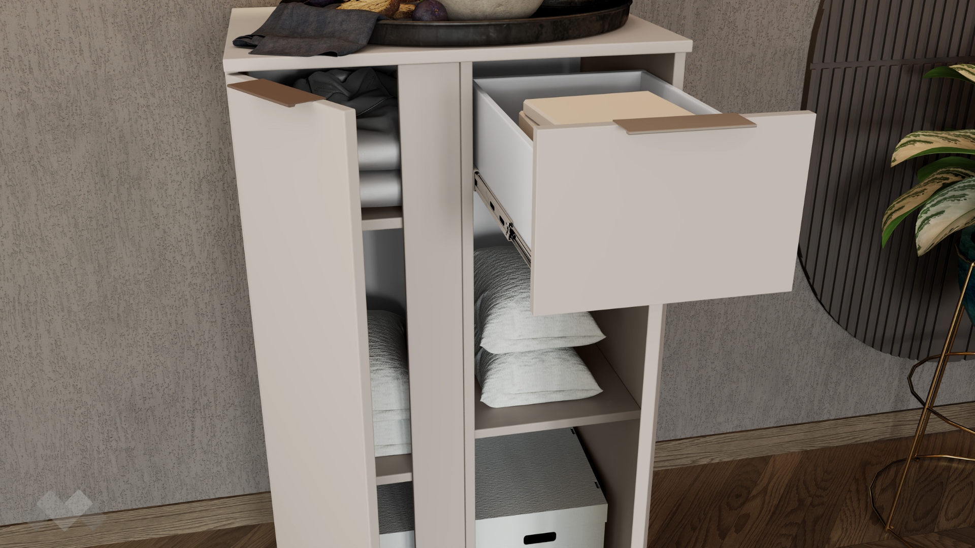 Моделът разполага с два шкафа с вратички и чекмедже. Зад вратичката, под чекмеджето ще откриеш удобен вътрешен рафт, а зад другата вратичка има разположени два вътрешни рафта. Те са идеални за сгънати дрехи, кутии, спално бельо или други вещи, които предпочиташ да съхраняваш подредено и на отделни нива. На твое разположение имаш и чекмедже, подходящо за по-малки предмети, аксесоари или документи, които трябва да са ти винаги под ръка. Чекмеджето е снабдено със сачмени водачи с пълно изтегляне, които осигуряват пълен достъп до съдържанието и гарантират дълготрайна устойчивост.