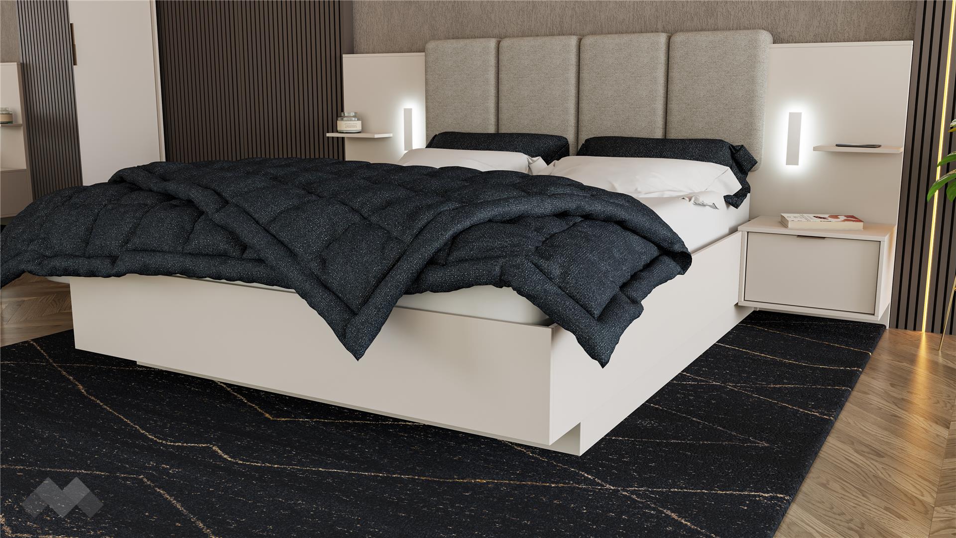 Спалнята е подходяща за матрак 160/200 см. Тапицираната табла носи усещане за лукс и комфорт, като осигурява удобна опора при четене, почивка или гледане на телевизия. Вграденото LED осветление е не само стилно, но и функционално, като елиминира нуждата от допълнителни нощни лампи. Включеният повдигащ мехнизъм позволява лесен достъп до пространството под матрака, предоставяйки възможност за съхранение на вещи и багаж, което е особено полезно в малки пространства.