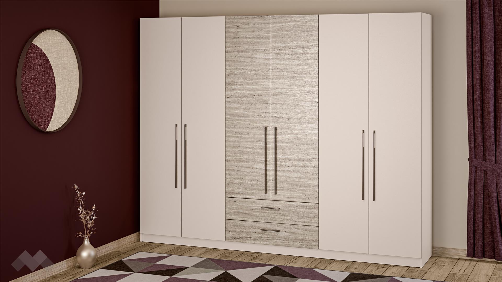Шесткрилен гардероб Керина е създаден с мисъл за комфорт и естетика, като обединява изчистен модерен дизайн и топли, спокойни тонове. Балансираната визия и функционалното му разпределение превръщат стаята в приятно и релаксиращо пространство, идеално за отдих и пълноценна почивка.