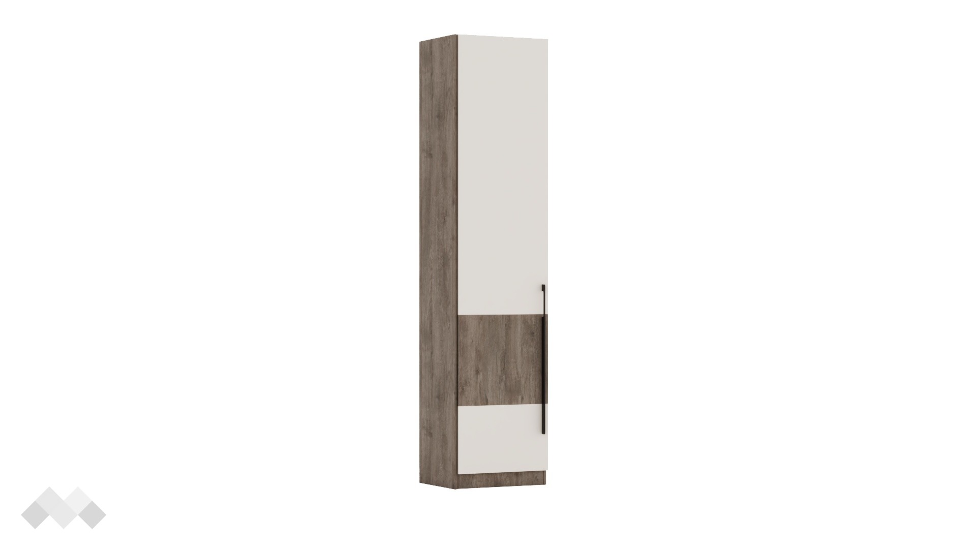 Двукрилният гардероб разполага с два рафта и лост за закачалки, а еднокрилният скосен гардероб е с четири рафта, което ще ти позволи да подредиш добре всичките си дрехи и аксесоари. А любимите си книги, скъпи спомени като сувенири и фотографии, декорации или вещи, които искаш да ти бъдат винаги под ръка, можеш да подредиш върху петте открити рафта на високия шкаф етажерка.