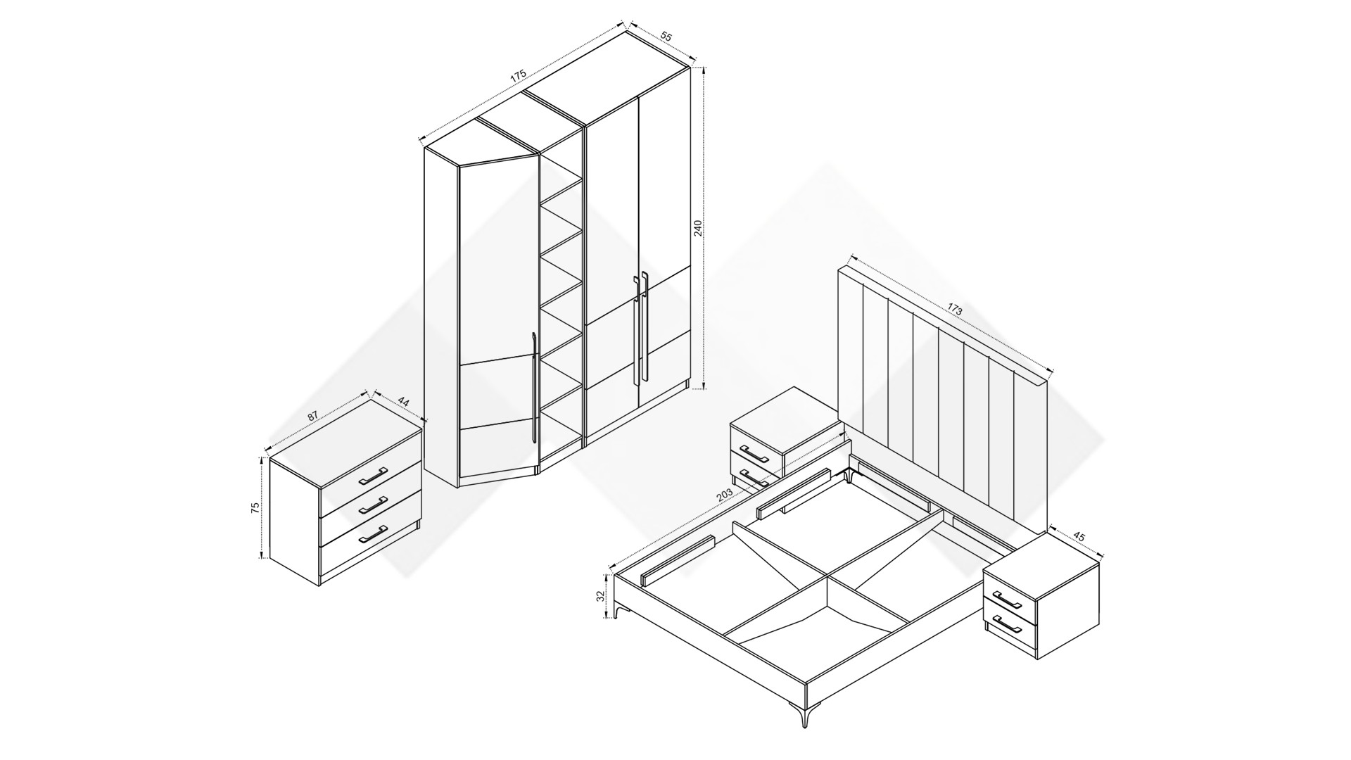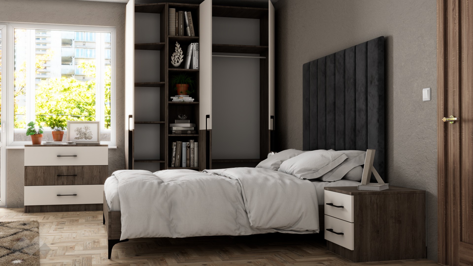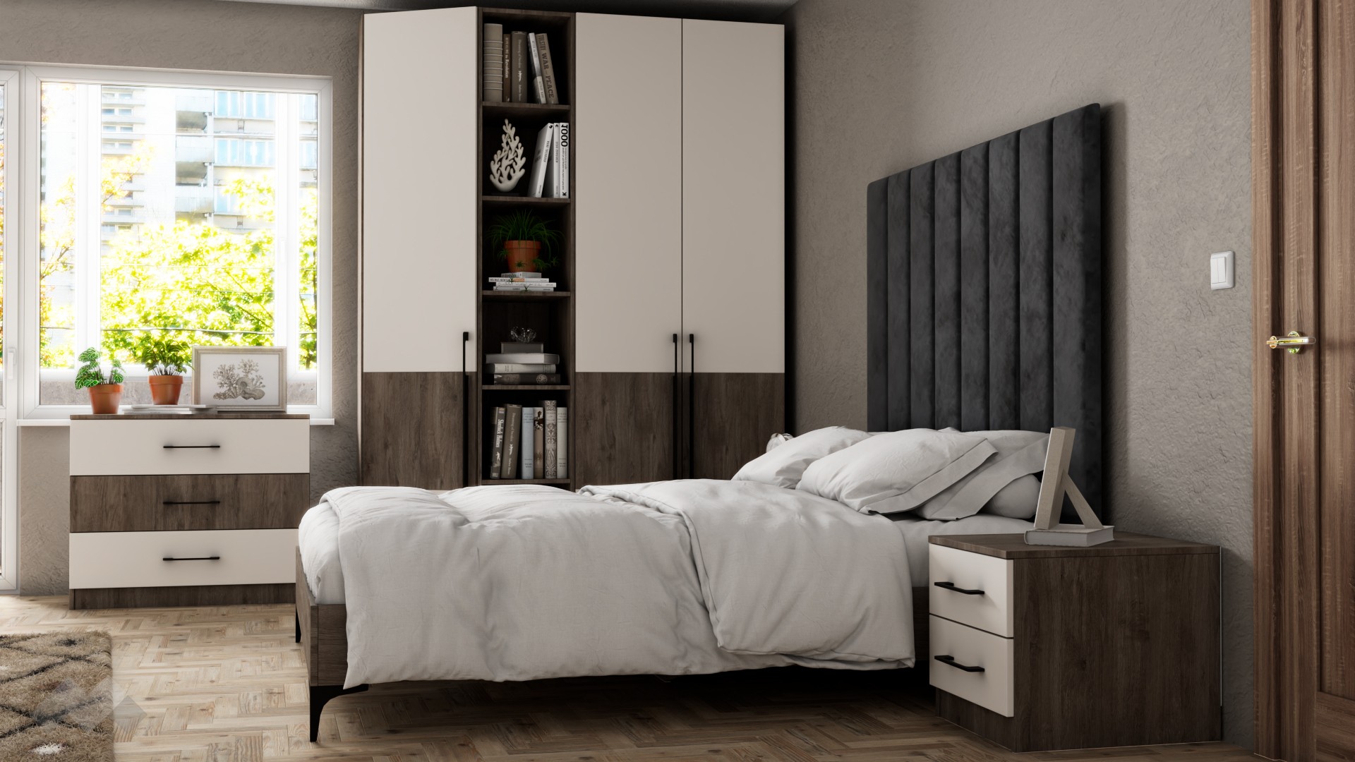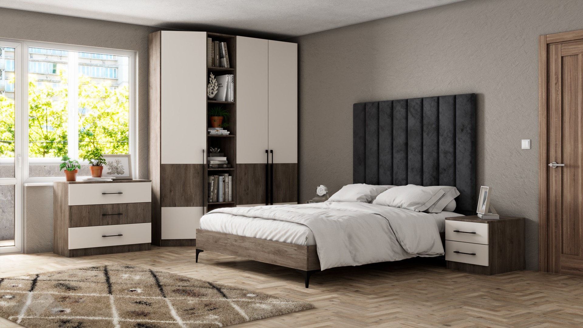 ⭐ Предимства: ✓ 18 мм ПДЧ ✓ спалня за матрак 160/200 ✓ тапицирана табла ✓ гардеробна система ✓ механизъм за плавно затваряне ✓ скрин с 3 чекмеджета ✓ две нощни шкафчета ✓ модерен и функционален дизайн