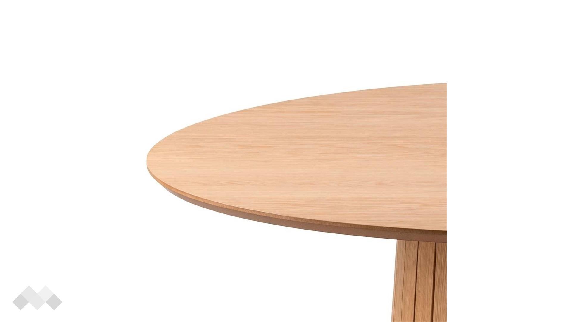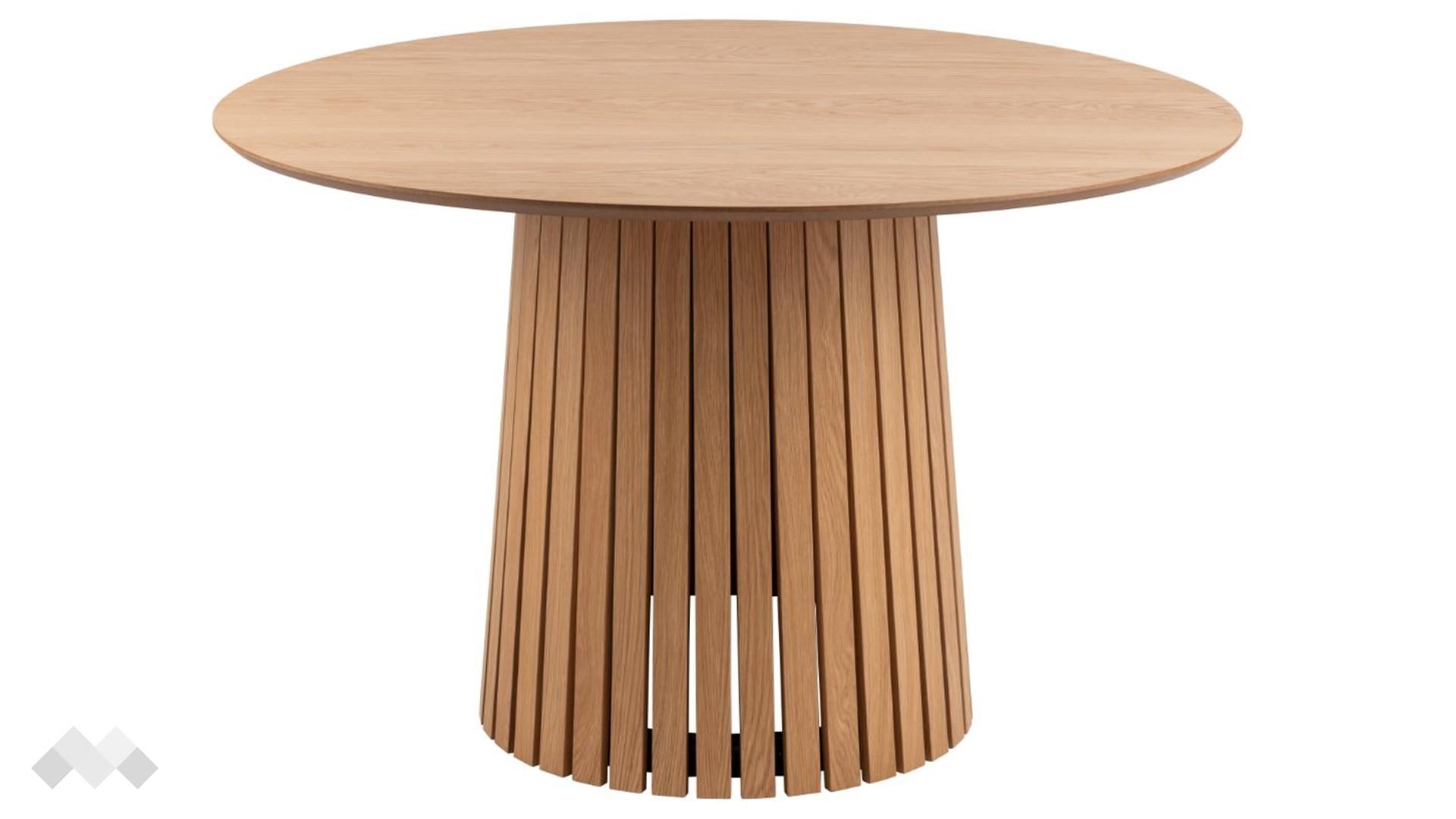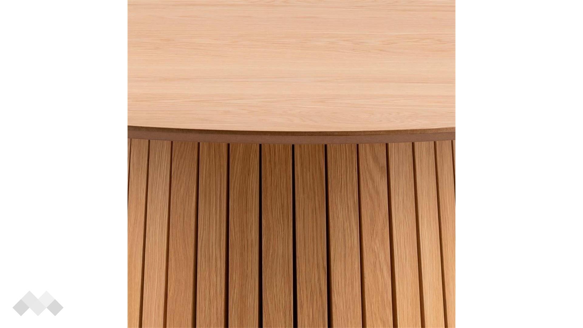 Трапезната маса Кристо съчетава изтънчен скандинавски стил и практична функционалност. Кръглият ѝ плот от МДФ придава усещане за топлина и уют, а колонната основа с декоративни вертикални ламели добавя елегантен акцент, който се вписва хармонично в модерни и класически интериори.