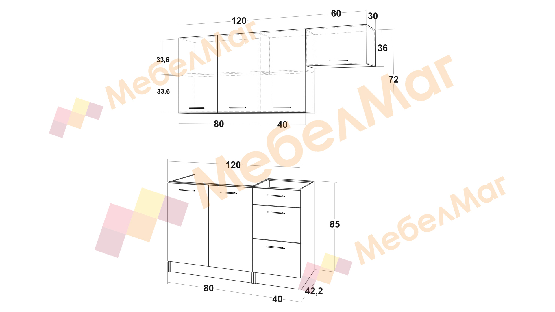 Долен модул: Д: 120 см. Ш: 42,2 см. В: 85см.