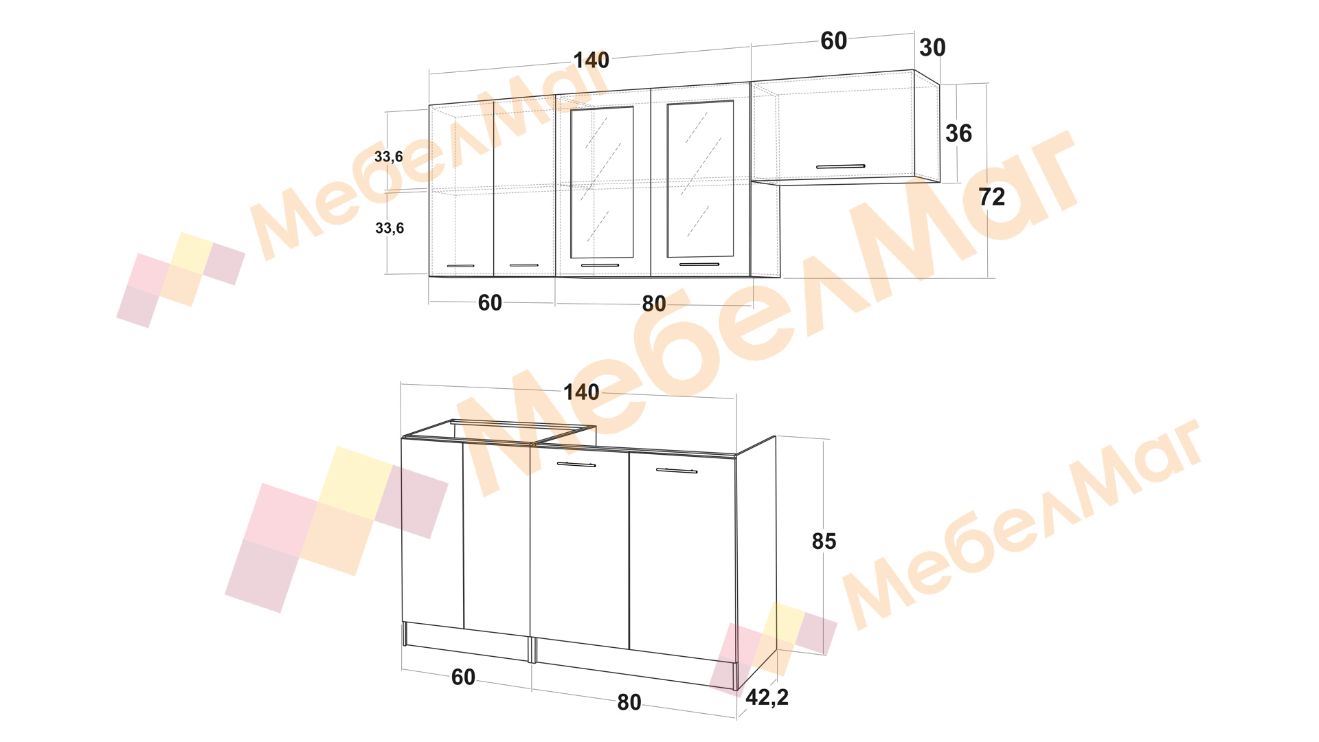 Долен модул: Д: 140 см. Ш: 42,2 см. В: 85см.