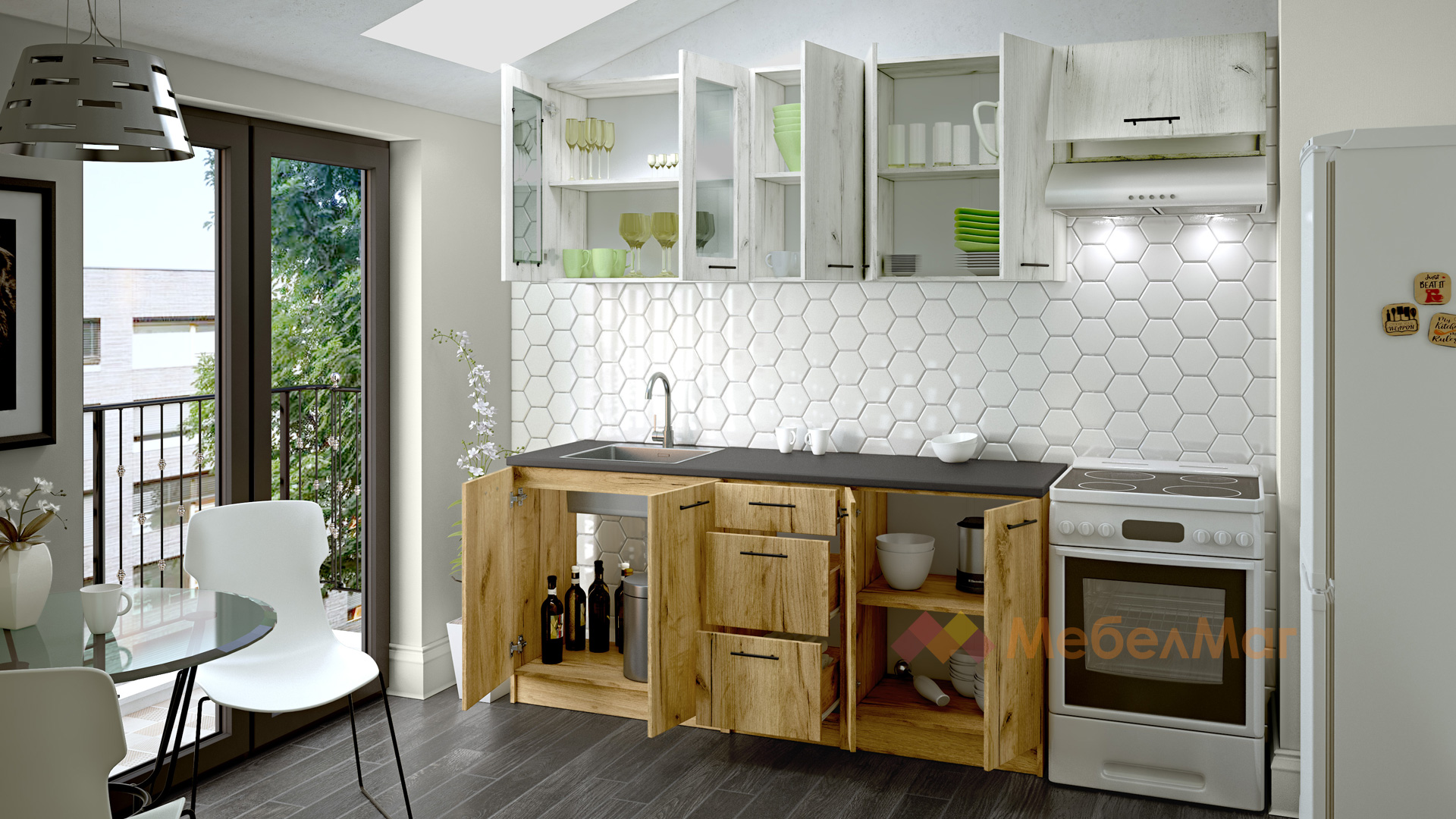 ✓ компактна и практична  ✓ шкаф с витрини ✓ хоризонтален шкаф ✓ шкаф за мивка ✓3 чекмеджета ✓ с монтаж към стената ✓ 16 мм ПДЧ