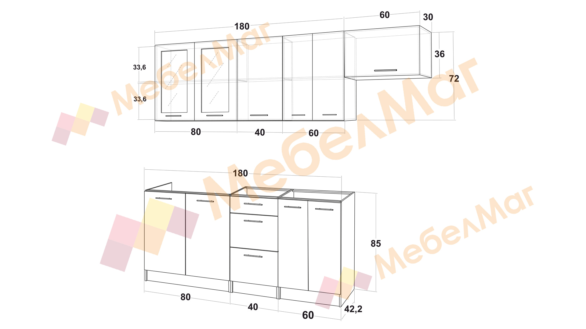 Долен модул: Д: 180 см. Ш: 42,2 см. В: 85см.