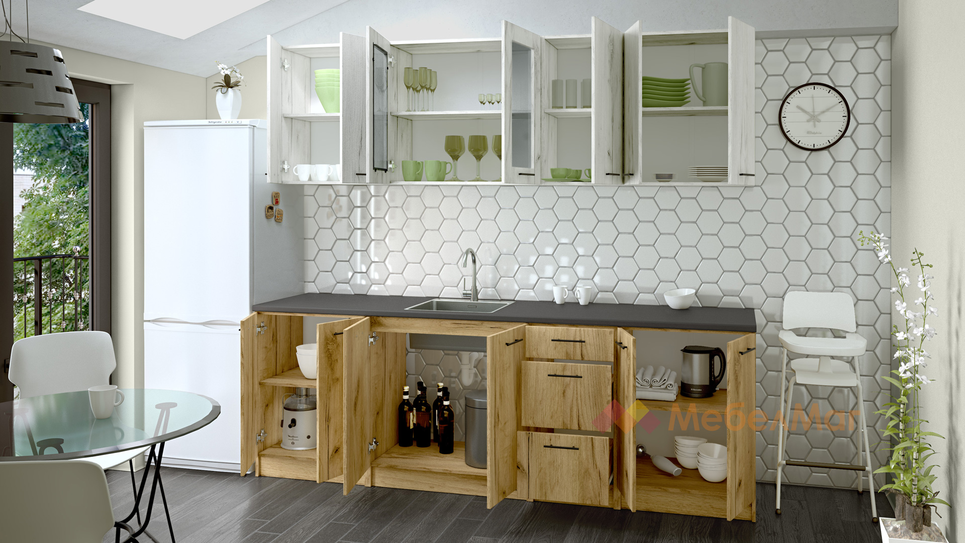 ⭐ Предимства: ✓ компактна и практична  ✓ шкаф за мивка ✓ шкаф с витрина ✓3 чекмеджета ✓ с монтаж към стената ✓ 16 мм ПДЧ