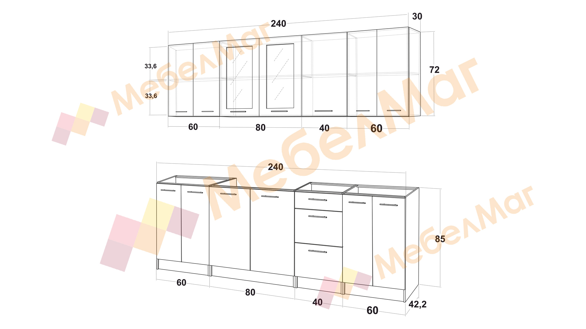 Долен модул: Д: 240 см. Ш: 42,2 см. В: 85см.