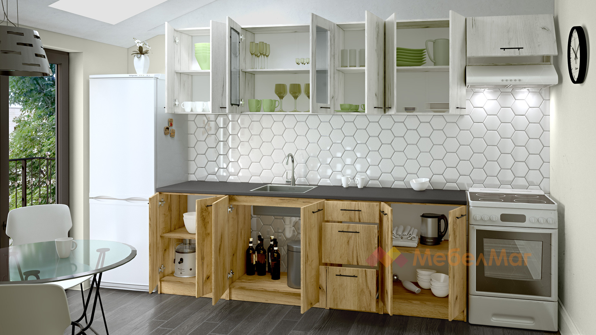⭐ Предимства: ✓ компактна и практична ✓ шкаф за мивка ✓ шкаф с витрина ✓ хоризонтален шкаф ✓3 чекмеджета ✓ с монтаж към стената ✓ 16 мм ПДЧ