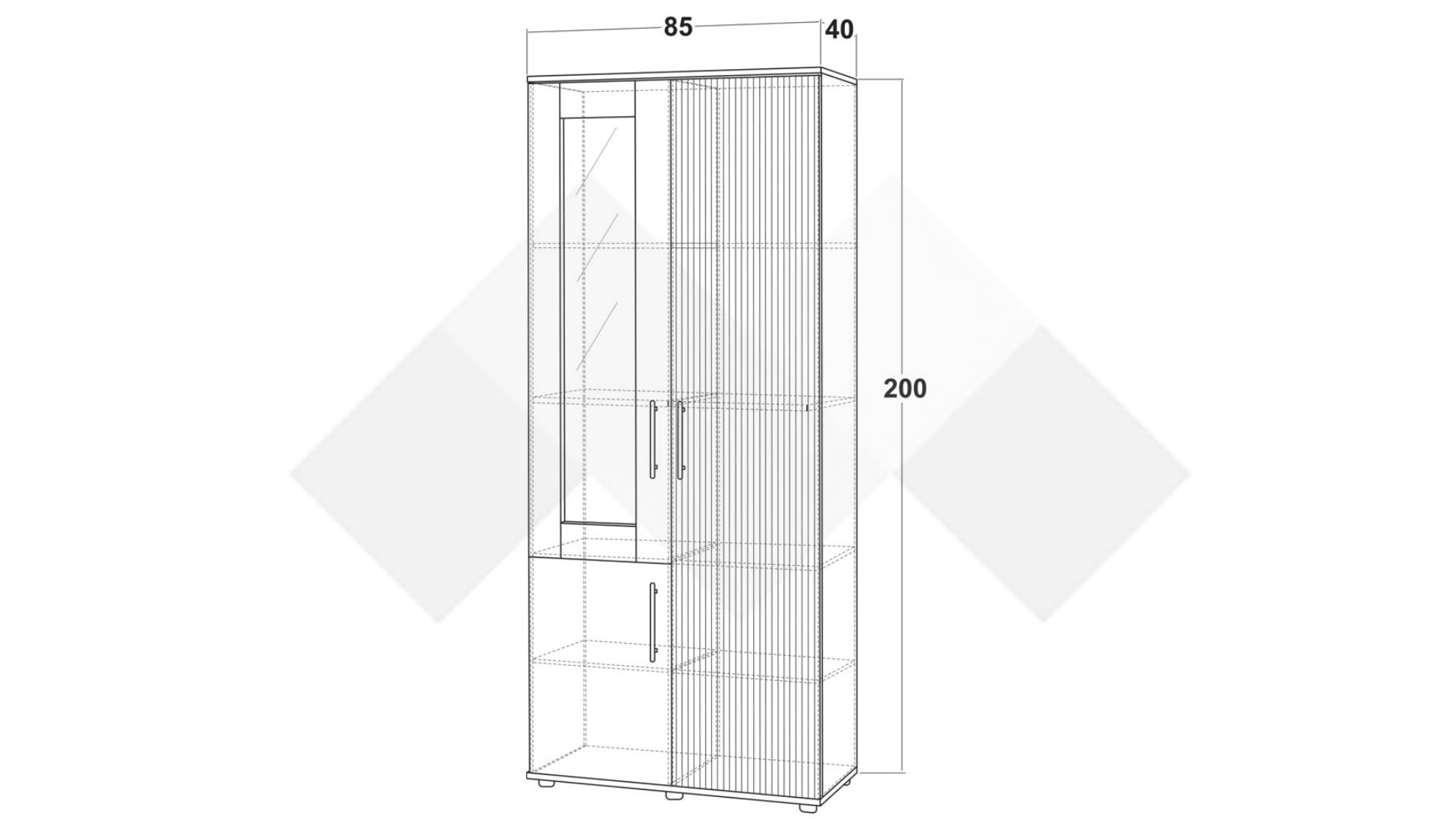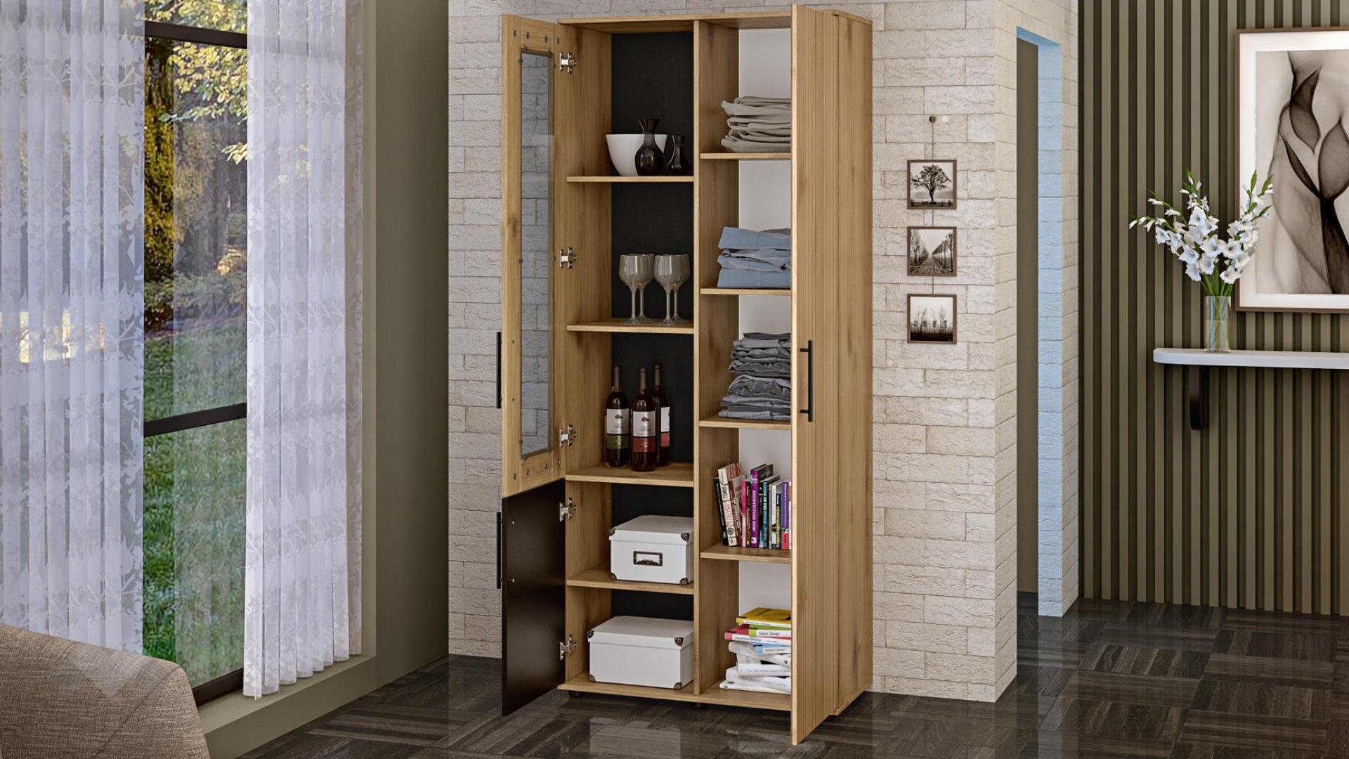Едната врата е витринна и зад нея са разположени четири рафта, идеални за излагане на декоративни елементи, сервизи или напитки. Под нея има още един плътен шкаф, предлагащ допълнително дискретно пространство за съхранение. Другата врата е плътна и разполага с четири рафта, осигуряващи място за сгънати дрехи, книги или други вещи, които искате да съхранявате прибрани.