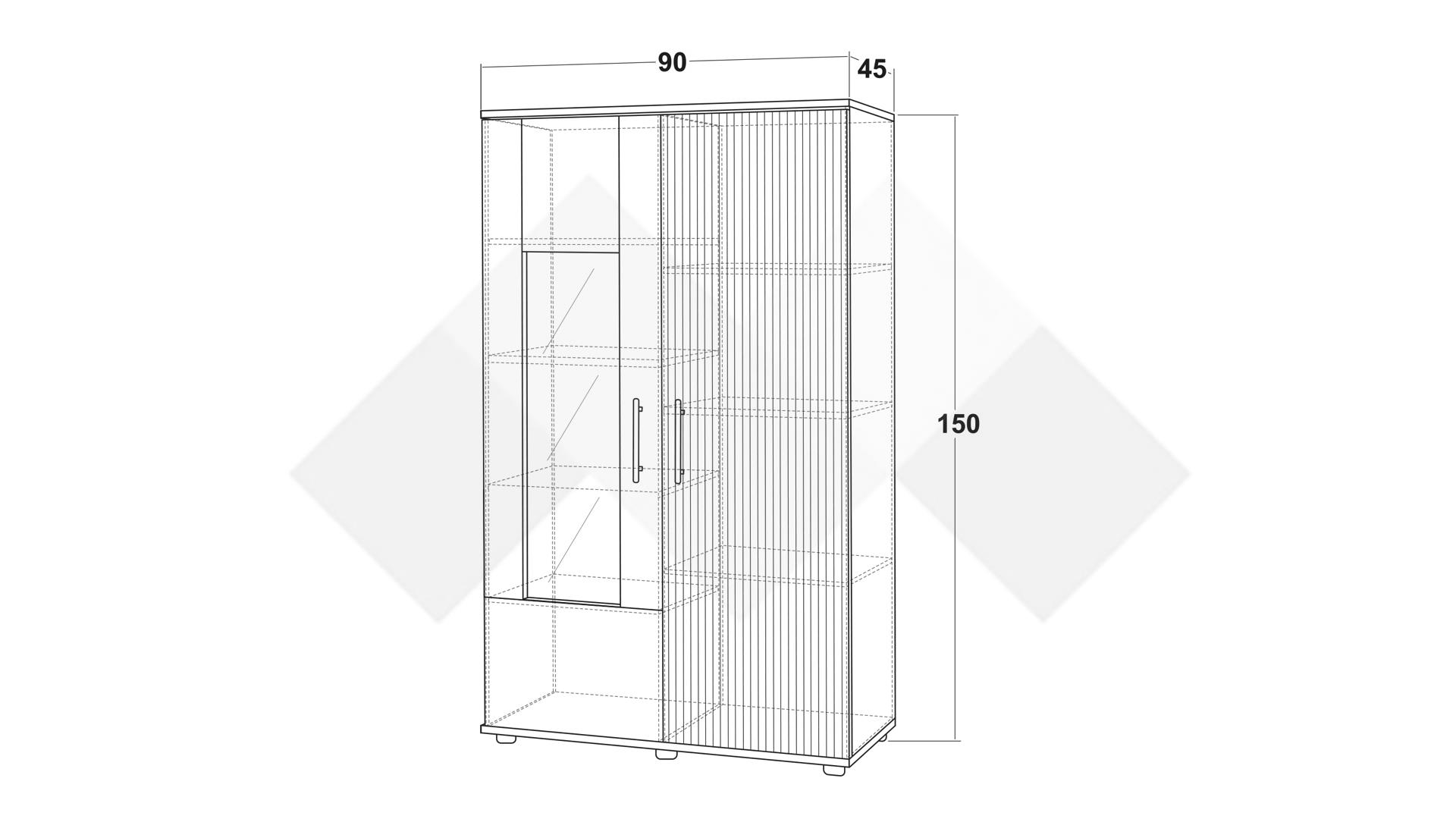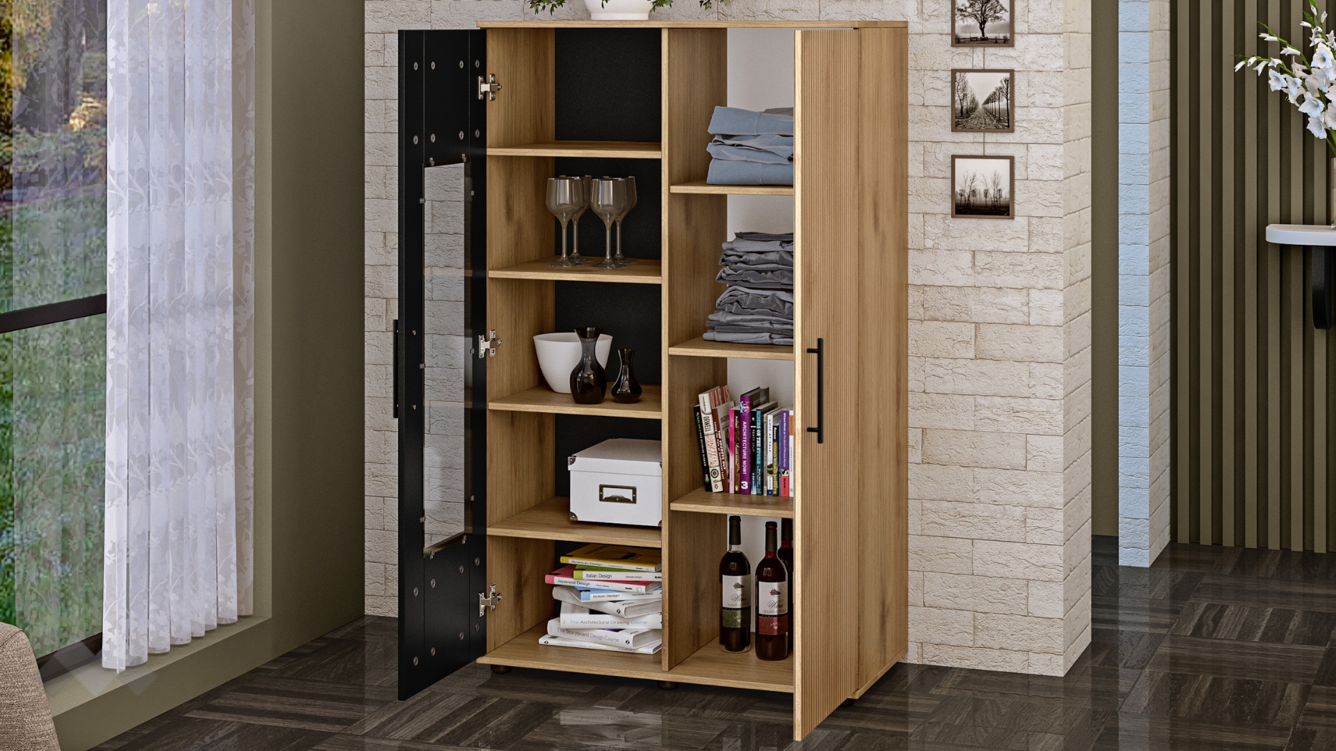Левият модул на двукрилния шкаф е със стъклена врата, зад която са разположени четири рафта, идеални за излагане на декоративни елементи, сервизи или напитки. Десният модул е с плътна врата зад която ще откриеш три рафта, осигуряващи място за книги или други вещи, които искате да съхранявате прибрани.