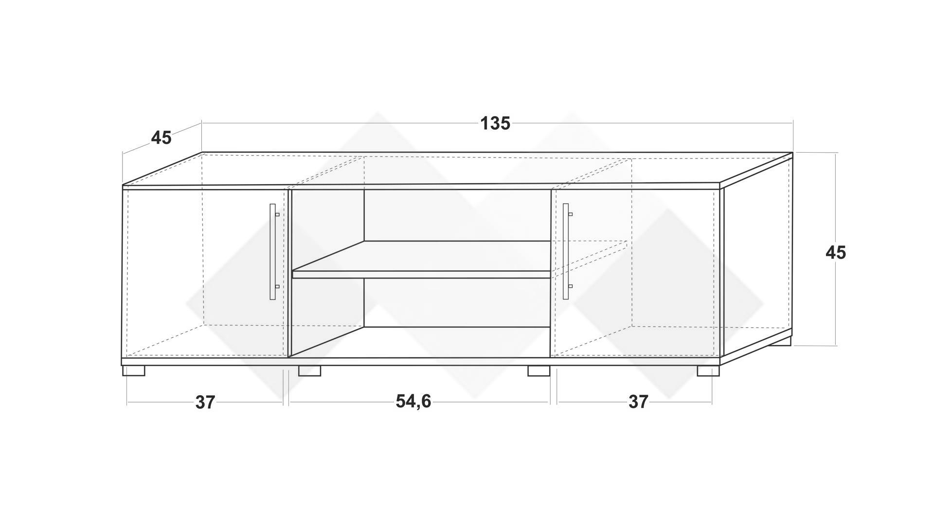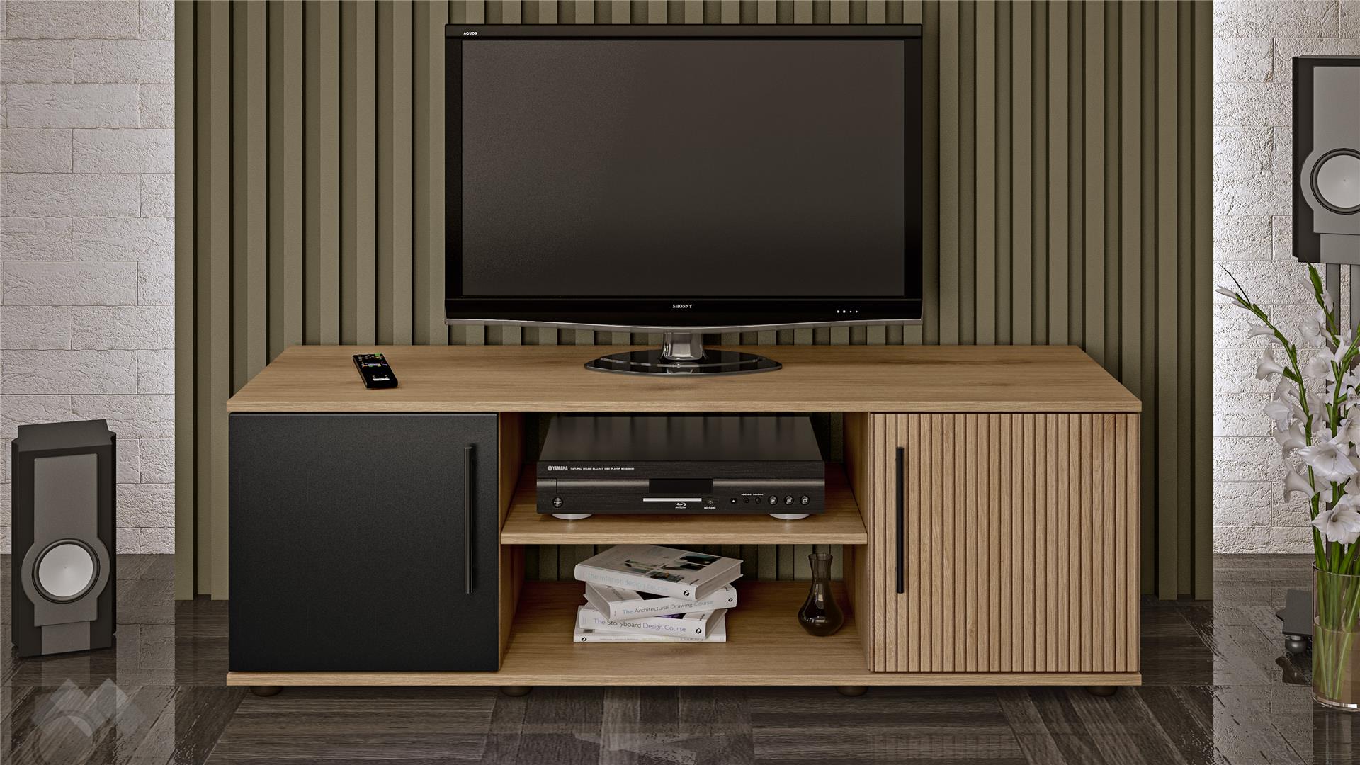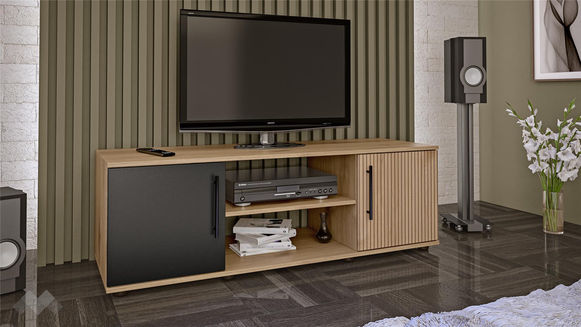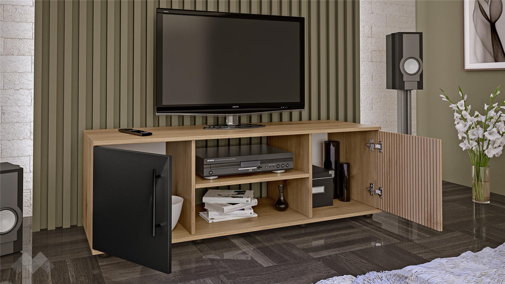 Моделът разполага с два затворени шкафа, които предлагат дискретно съхранение на вещи като дистанционни, кабели, книги или документи. Между тях се намира открит рафт - идеален за поставяне на мултимедийни устройства като ТВ приемник, конзола или рутер. Горният плот е устойчив и подходящ за телевизори с различен размер.