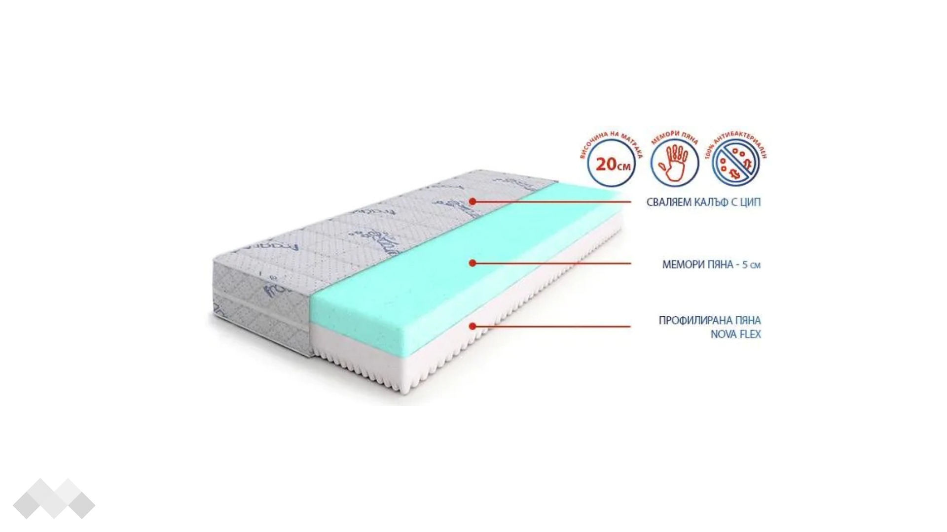 Другият основен материал в модела е профилирана Nova Flex пяна – пяна с отлични ортопедични качества, която поддържа гръбначния стълб в правилна позиция. Тази комбинация от два вида висококачествени пяни осигурява идеален баланс между комфорт и опора, гарантирайки здравословна позиция на тялото през цялата нощ.