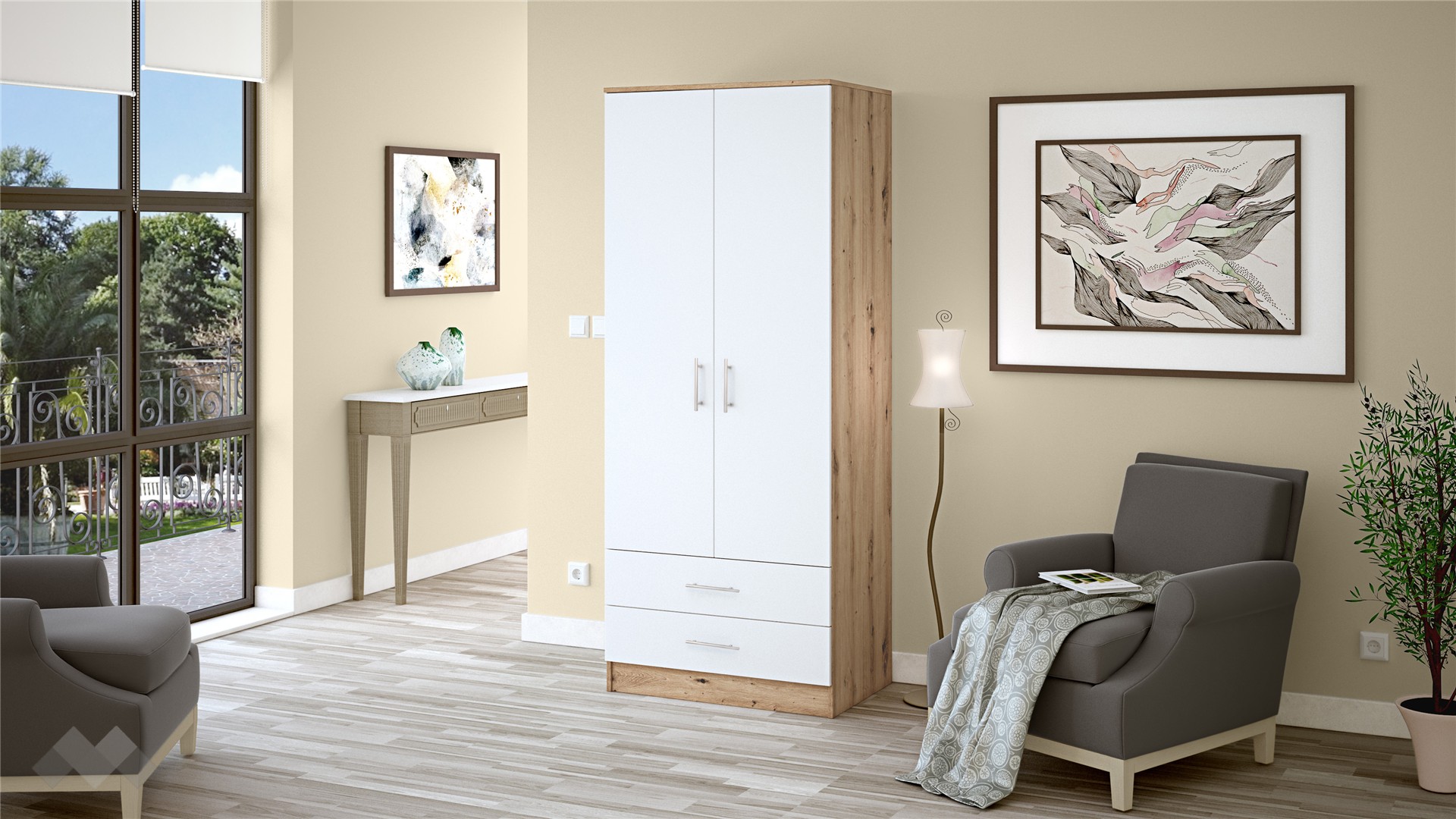⭐ Предимства: ✓ двукрилен ✓ 2 чекмеджета ✓ лост за закачалки ✓ модерен декор ✓ практично разпределение ✓ качествена изработка ✓ 16 мм ПДЧ