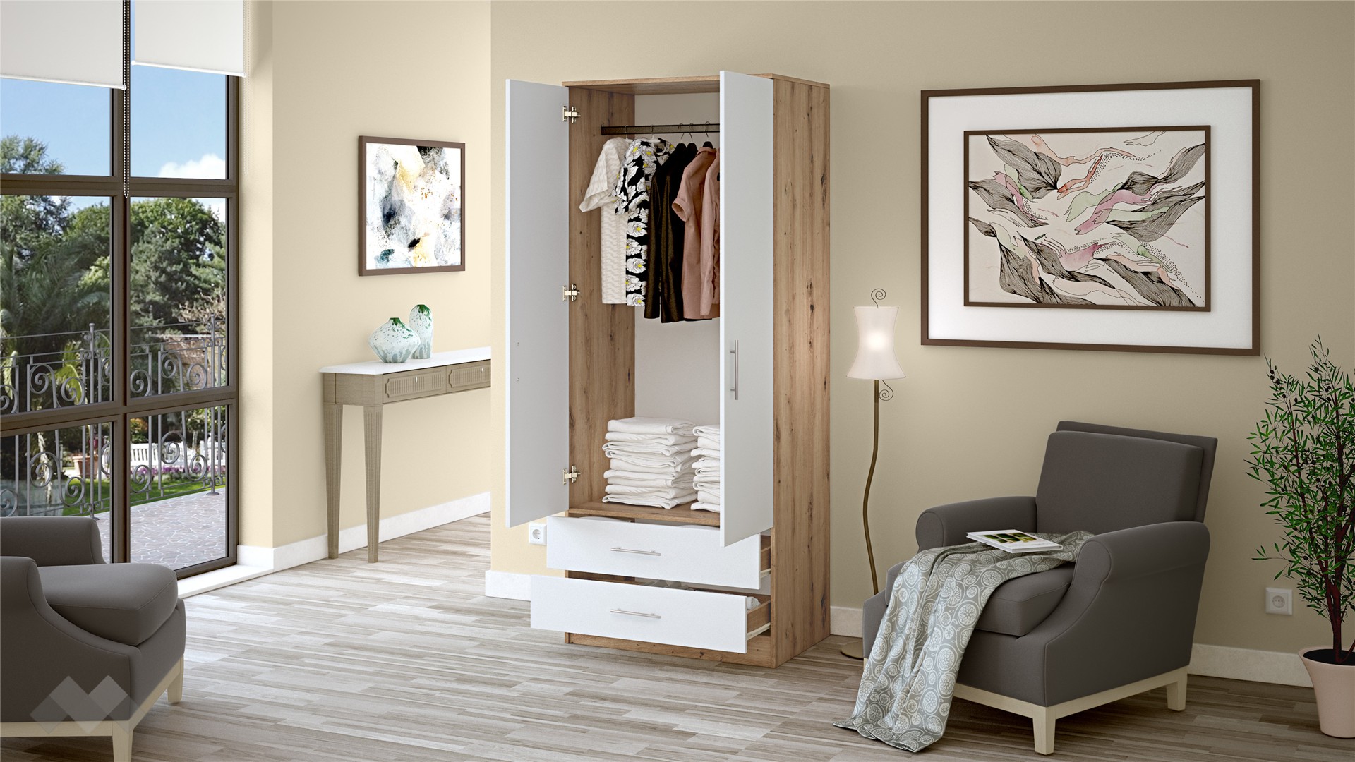 Зад крилата ще намериш широко пространство и лост за закачалки, където да съхраниш ризи, сака или по-обемни дрехи като палта. В долната част гардеробът изненадва с нестандартно решение от две чекмеджета, където можеш да организираш бельо, чорапи, малки електроуреди или друг вид вещи, нуждаещи се от място.