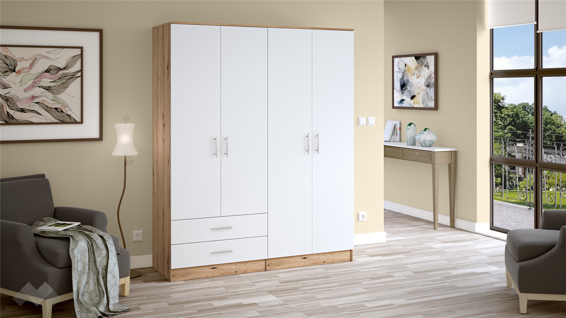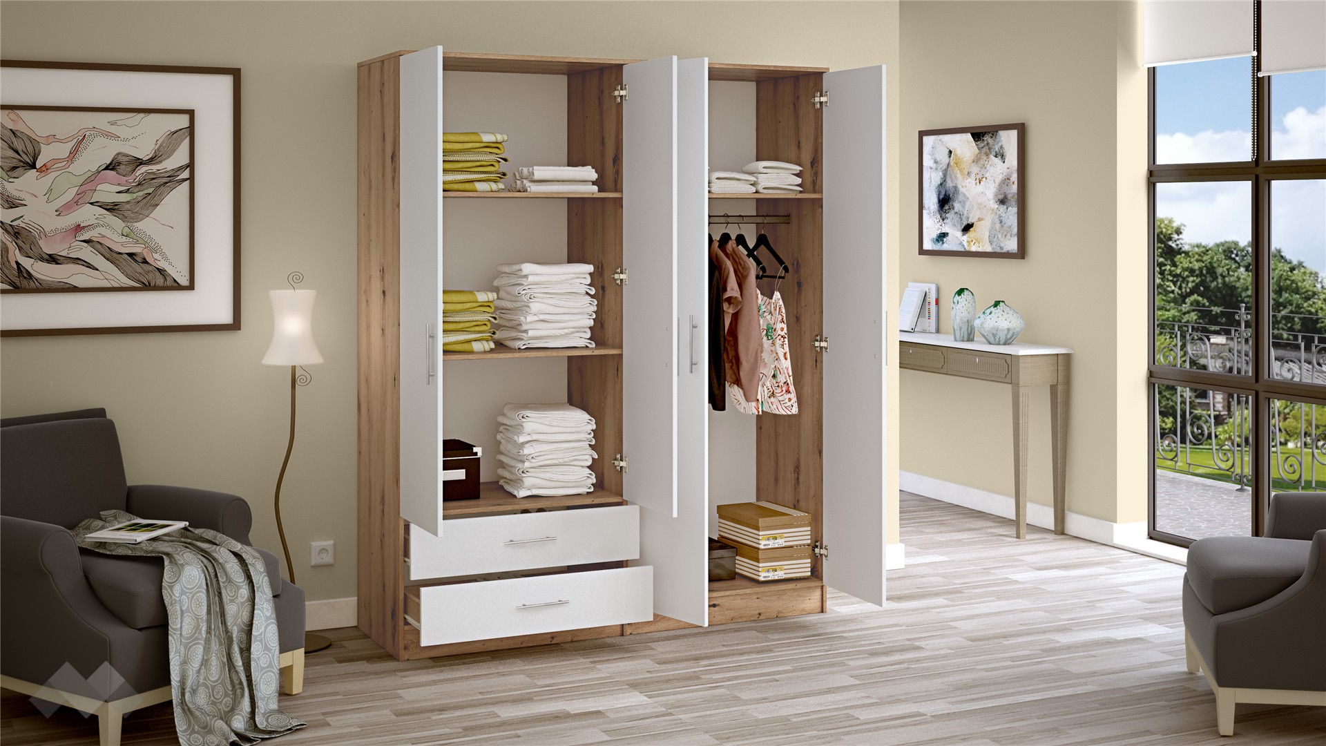 ⭐ Предимства: ✓ четирикрилен ✓ 2 чекмеджета ✓ 3 рафта ✓ лост за закачалки ✓ модерен декор ✓ практично разпределение ✓ качествена изработка ✓ 16 мм ПДЧ