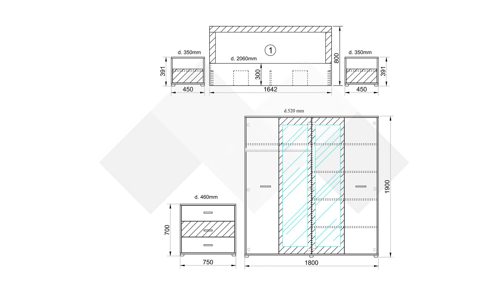 Голямото предимство на този спален комплект е просторния гардероб. Гардеробът ти предоставя доста място за съхранение, за да побере всичките ти тоалети. Предлага практично разпределение с 5 рафта и лост за закачалки, така че да организираш лесно дрехите си и да имаш бърз достъп до тях. Монтираното на гардероба огледало дава удобство при избора на тоалет и визуално прави стаята по-голяма и светла.