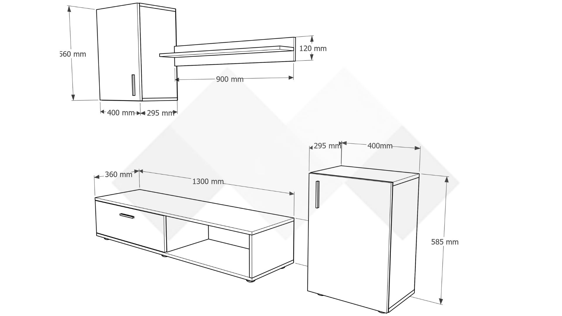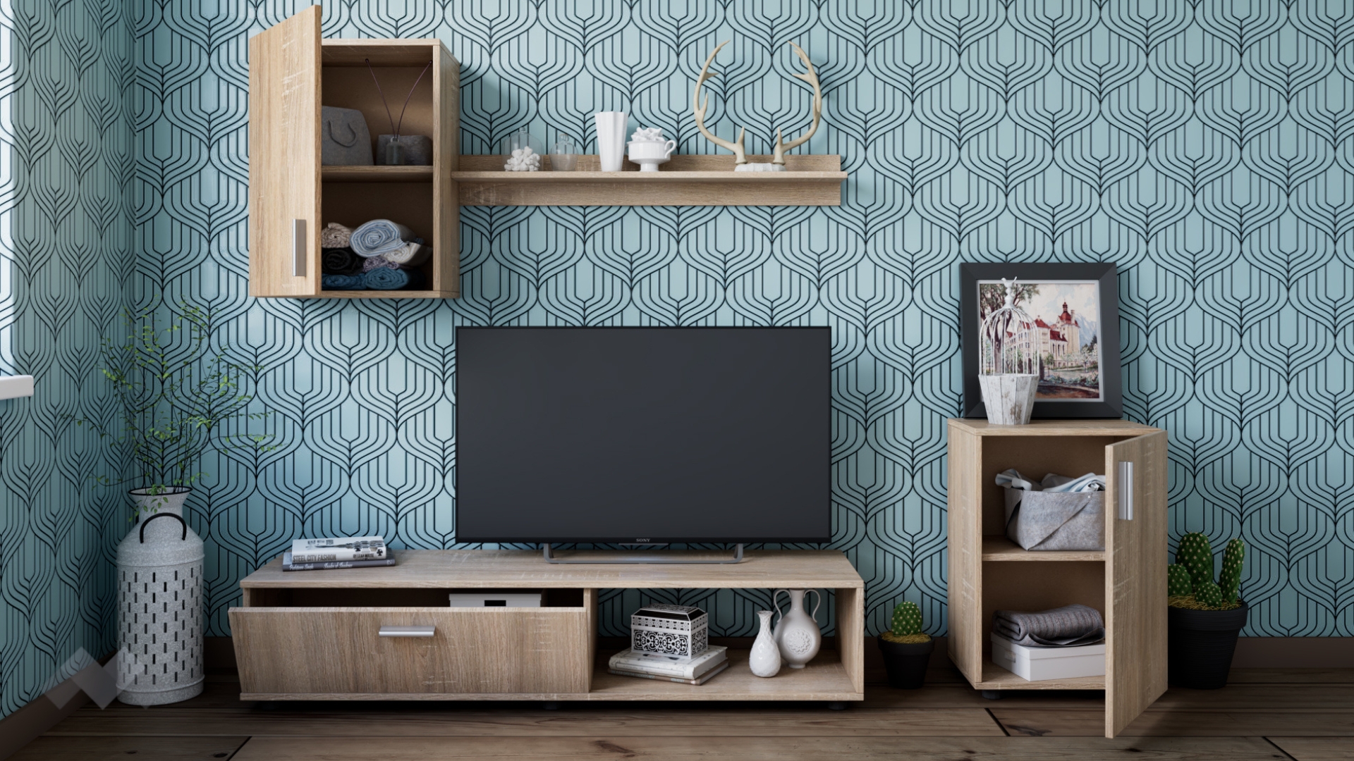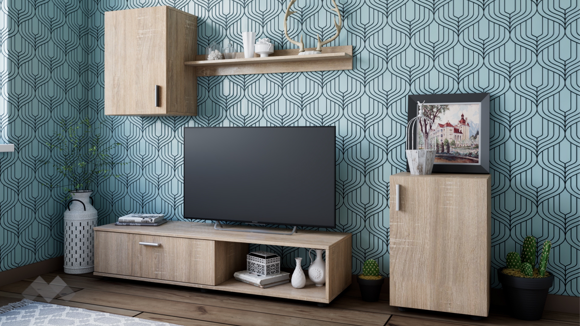 ТВ шкафът се състои от шкаф с падаща врата и отворена ниша, където да поставиш цялата си съпътстваща техника като ТВ приемници, DVD плейъри и други. Високият шкаф ще ти предостави достатъчно място за всички неща, които предпочиташ да останат скрити от погледите, а върху горния плот можеш да подредиш украси по твой вкус. Окаченият шкаф ще приюти всичките ти сервизи, съдове или други вещи, които искаш да ти бъдат винаги под ръка. Етажерката е идеална за подреждане на любимите ти книги, сувенири, фотографии или стилни декорации.