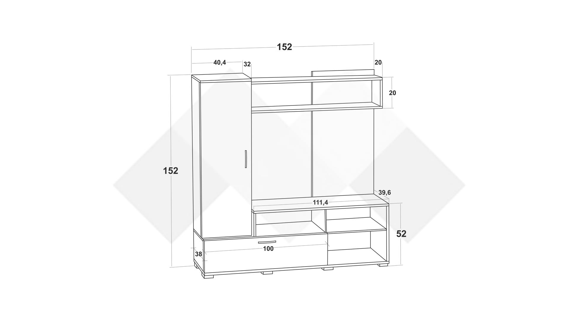 Д: 152 см. Ш: 39.6 см. В: 152 см.