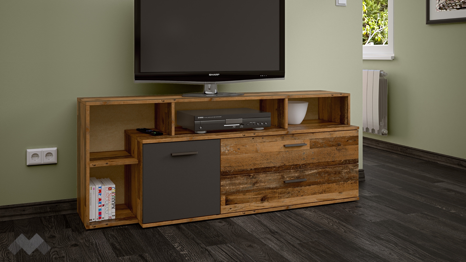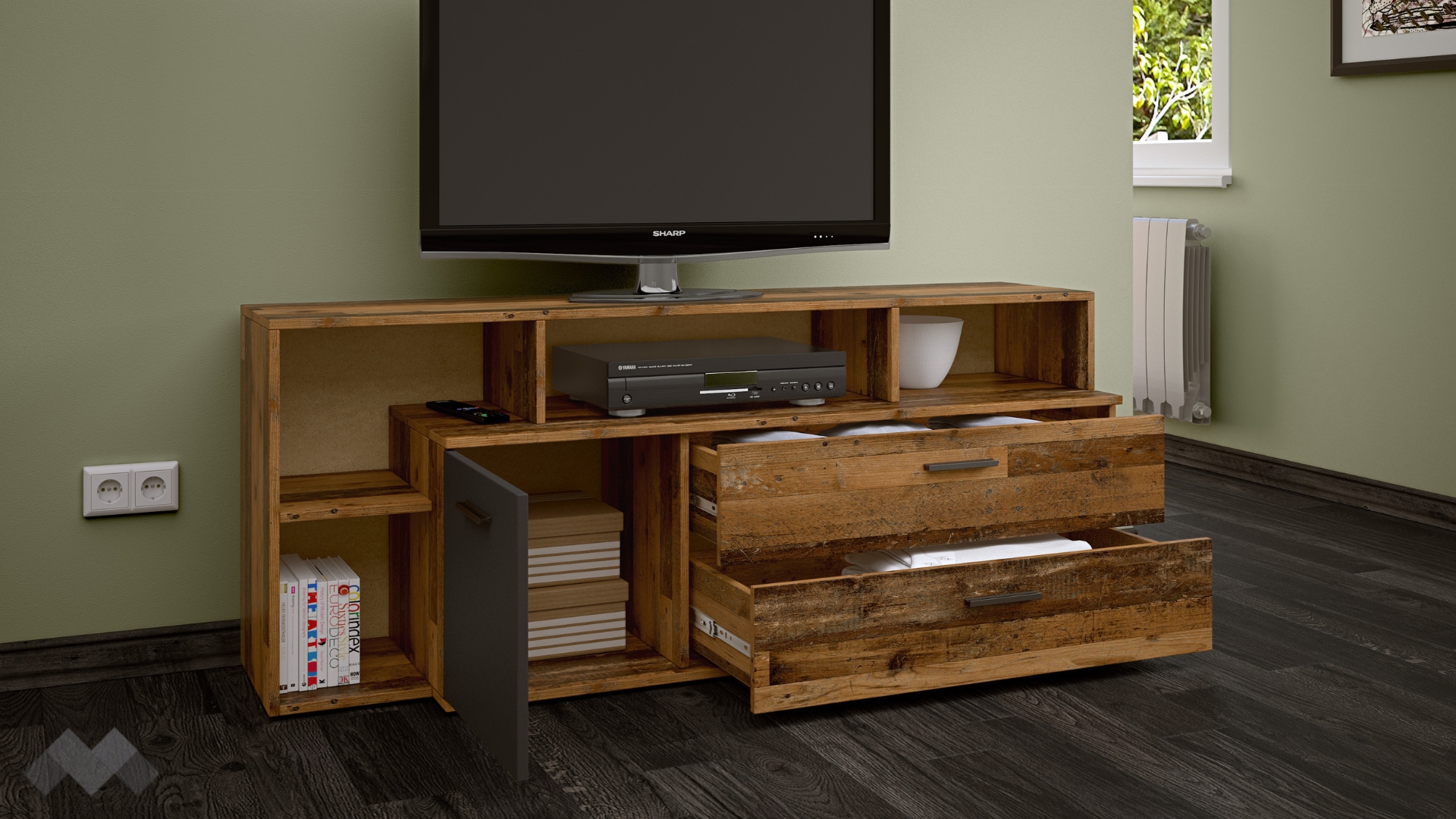 ⭐ Предимства: ✓ място за ТВ ✓ 4 открити рафта ✓ затворен шкаф ✓ 2 чекмеджета ✓ компактен и практичен ✓ качествена изработка ✓ 16 мм ПДЧ