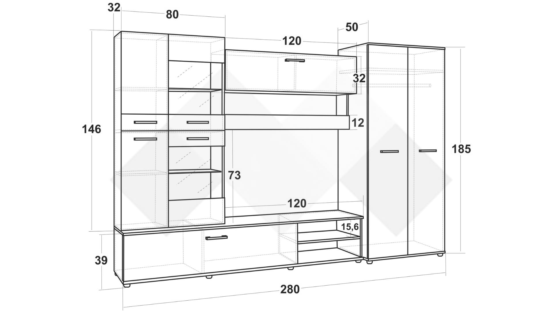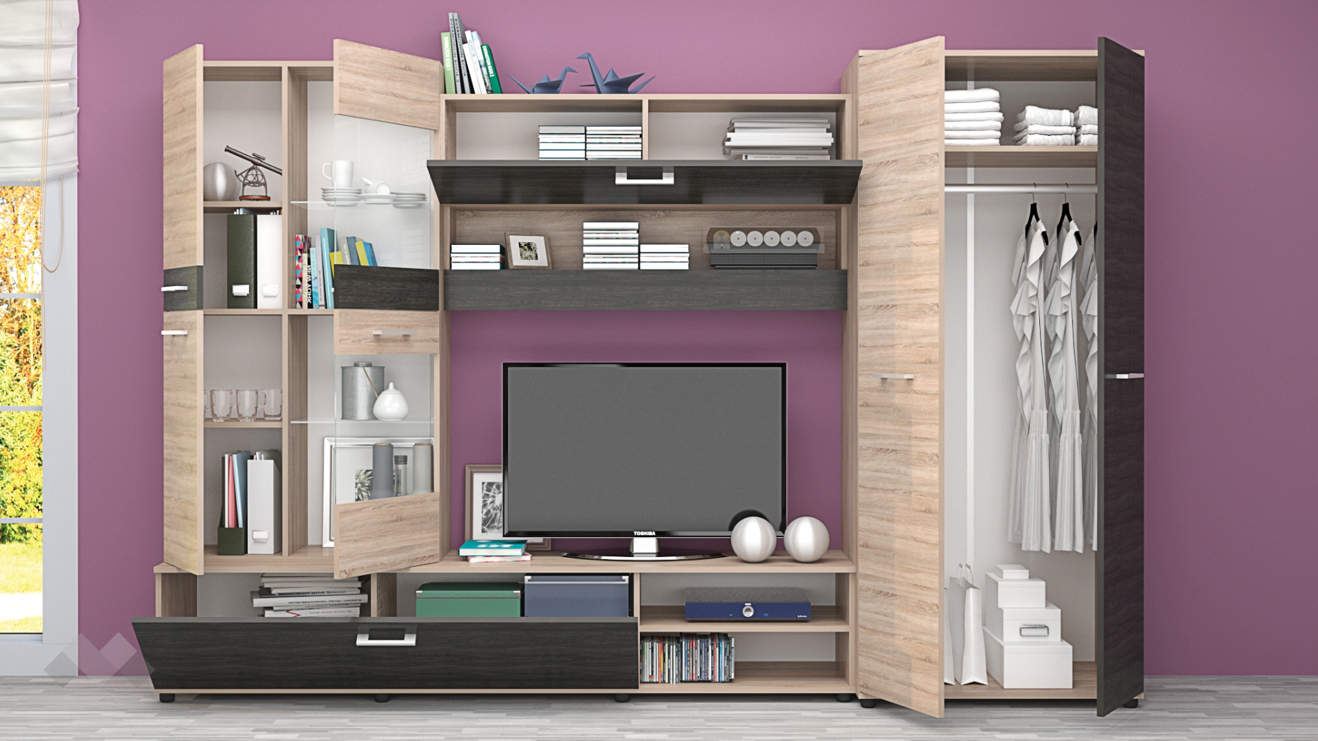 ⭐ Предимства: ✓ голямо и функционално място за съхранение ✓ ТВ шкаф ✓ висок шкаф ✓ LED осветление ✓ двукрилен гардероб ✓ шкаф с падаща врата ✓ отворен рафт ✓ механизъм за плавно затваряне ✓ качествена изработка ✓ 16 мм ПДЧ
