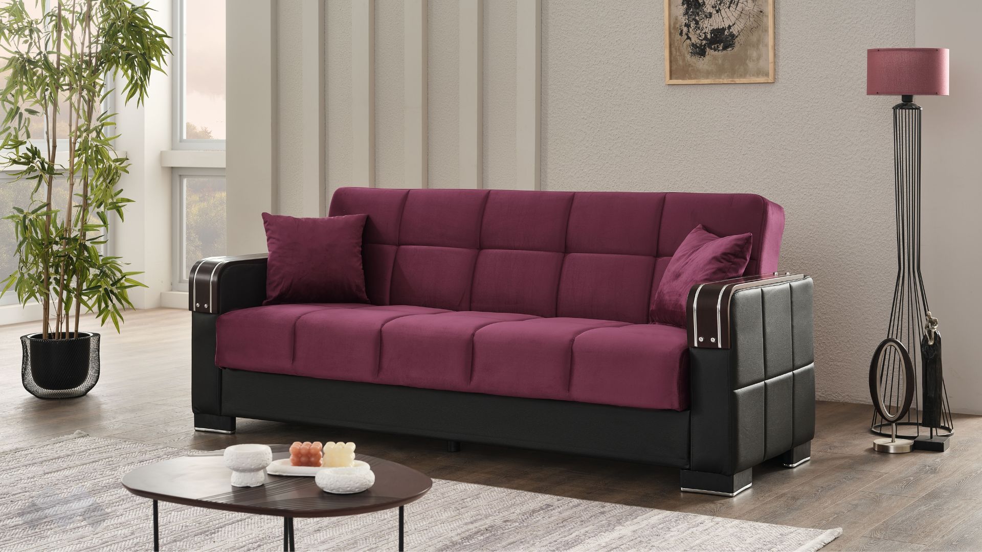Диван Малатия е и функционален - благодарение на клик-клак механизма ще разполагаш с повече пространство за релакс - 112/190 см, а под седалката се крие удобна ракла, където да съхраняваш завивки, възглавници и други вещи. Дамаската е приятна на допир, изработена от здрав и устойчив текстил, а за още по изтънчена визия, подлакътниците са с покрити с матово-черна еко кожа.