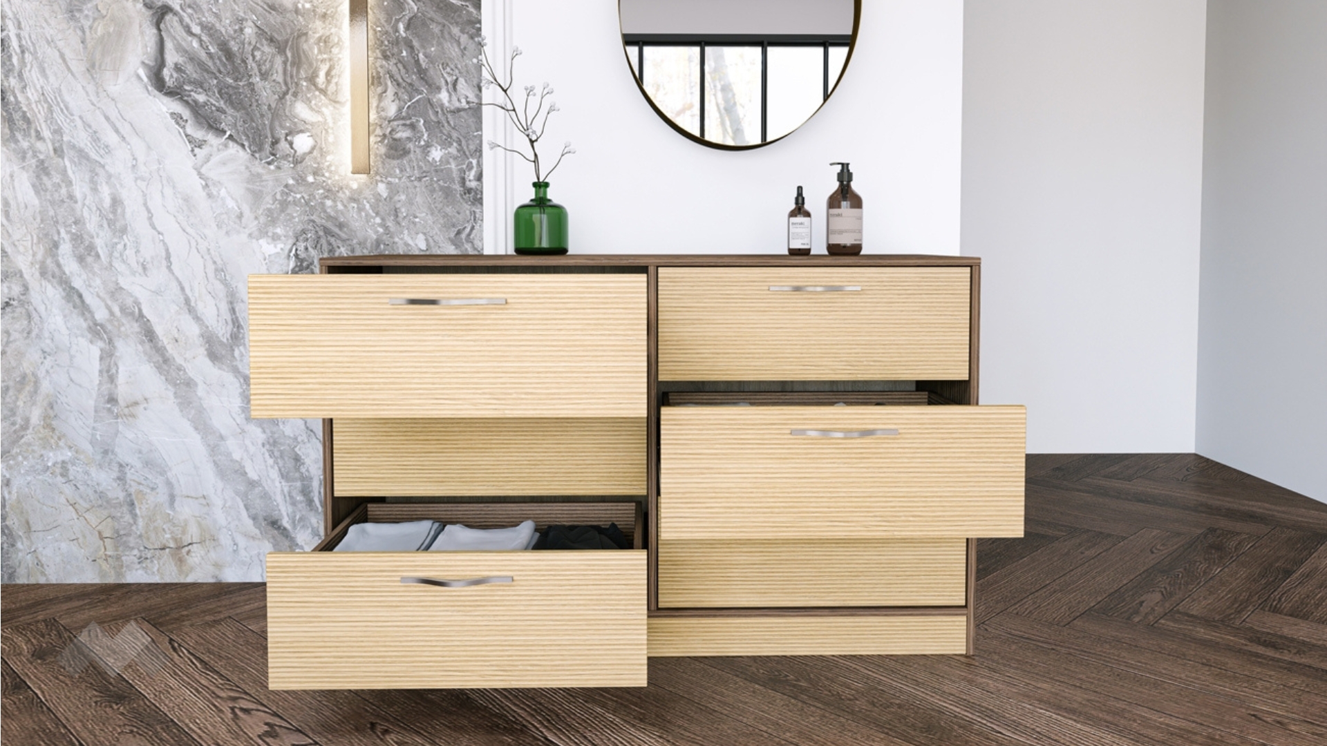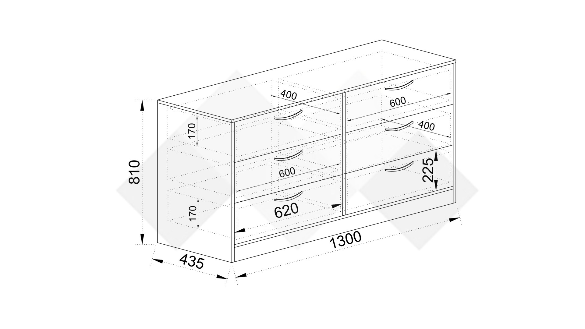 На твое разположение са шест просторни чекмеджета, в които можеш да организираш сгънати дрехи, бельо, аксесоари, малки електроуреди или други необходими за теб неща. Благодарение на равномерното разпределение и удобната дълбочина, можеш да ги използваш тематично – например за бельо, тениски, аксесоари или дори документи и текстил. Така всяка вещ ще има своето място и ще бъде винаги под ръка.
