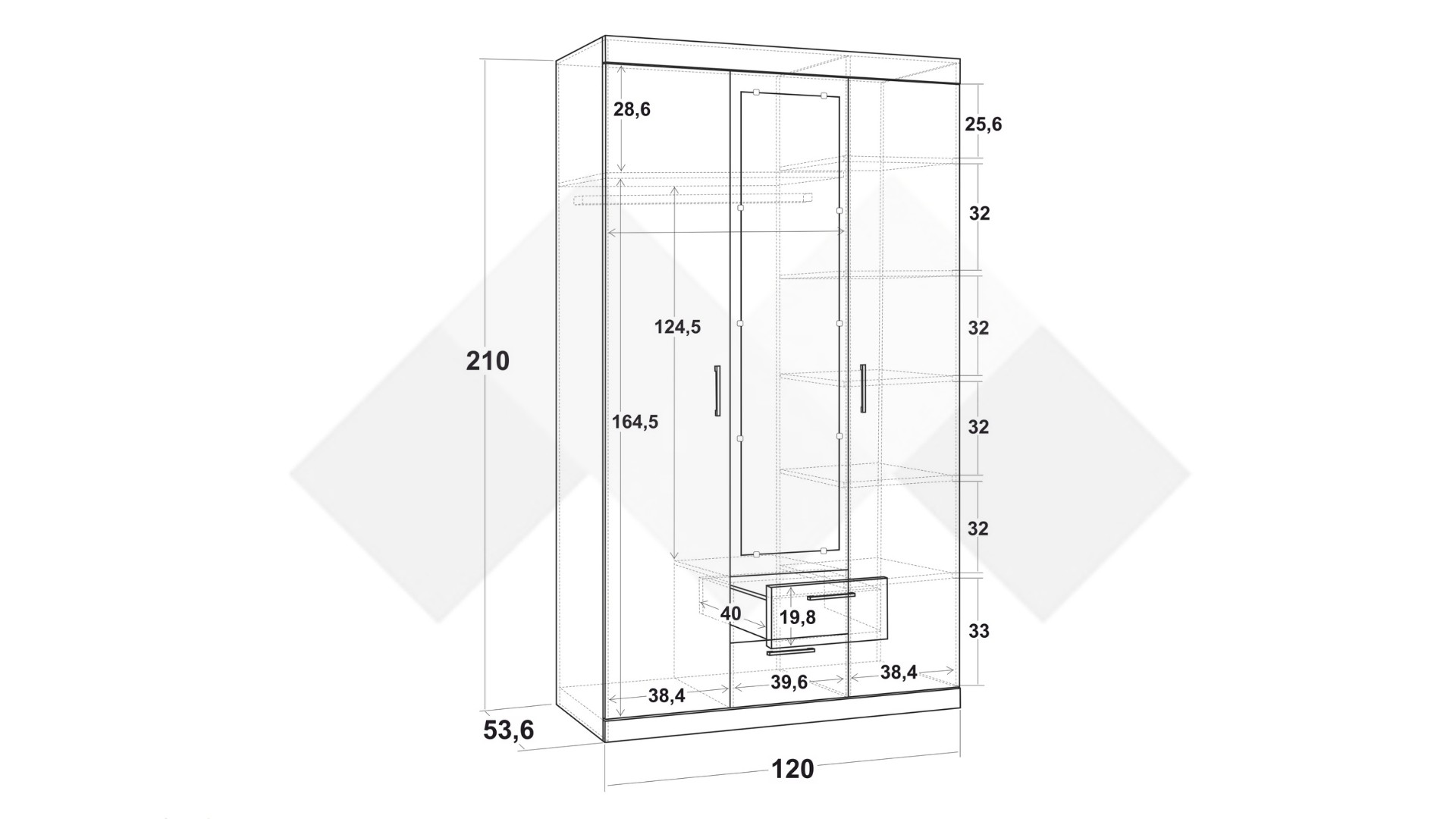 Д: 120 см Ш: 53.6 см В: 210 см