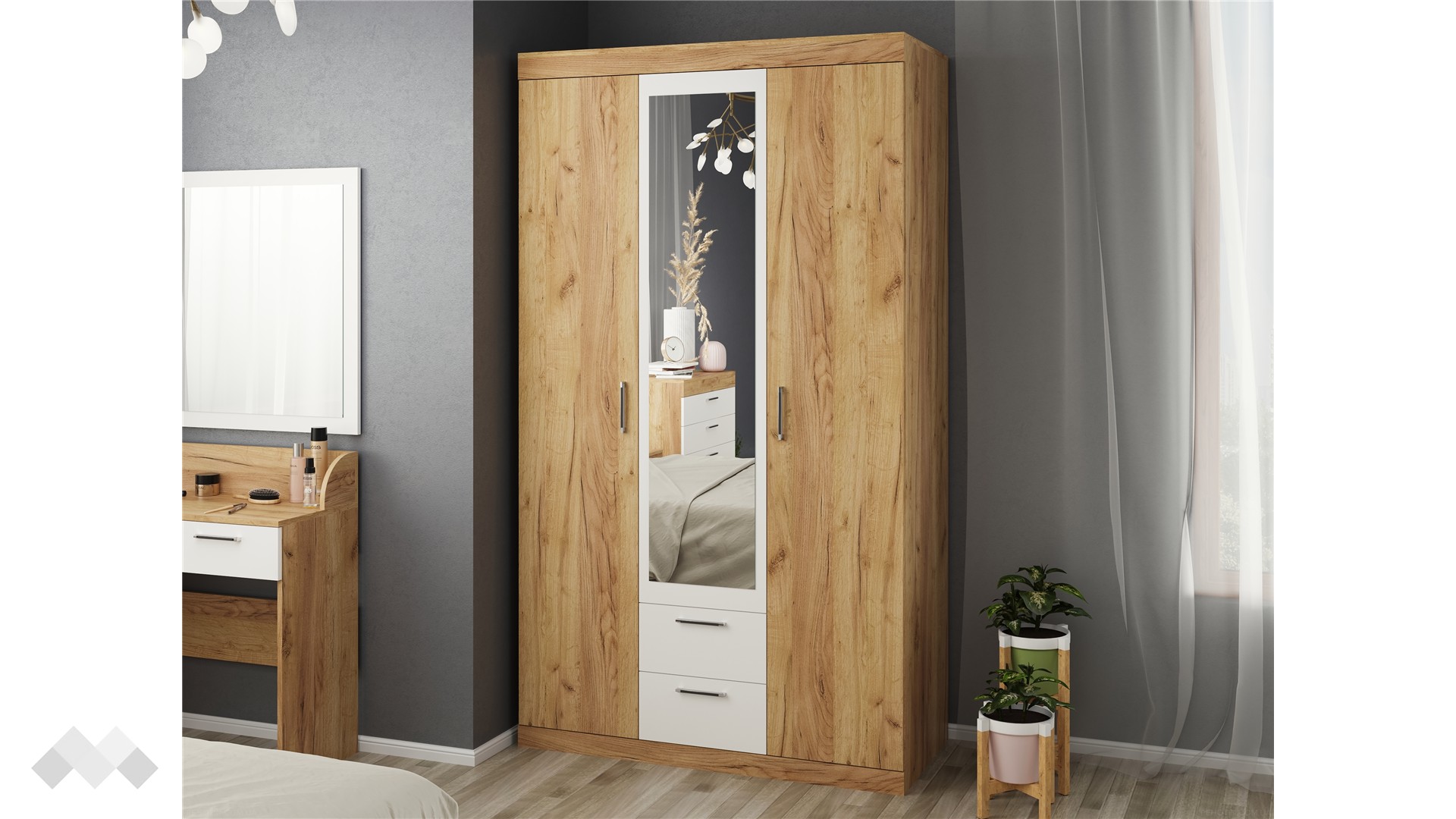⭐ Предимства: ✓ трикрилен ✓ 2 чекмеджета ✓ 7 рафта ✓ огледало ✓ лост за закачалки ✓ модерен декор ✓ практично разпределение ✓ качествена изработка ✓ 16 мм ПДЧ
