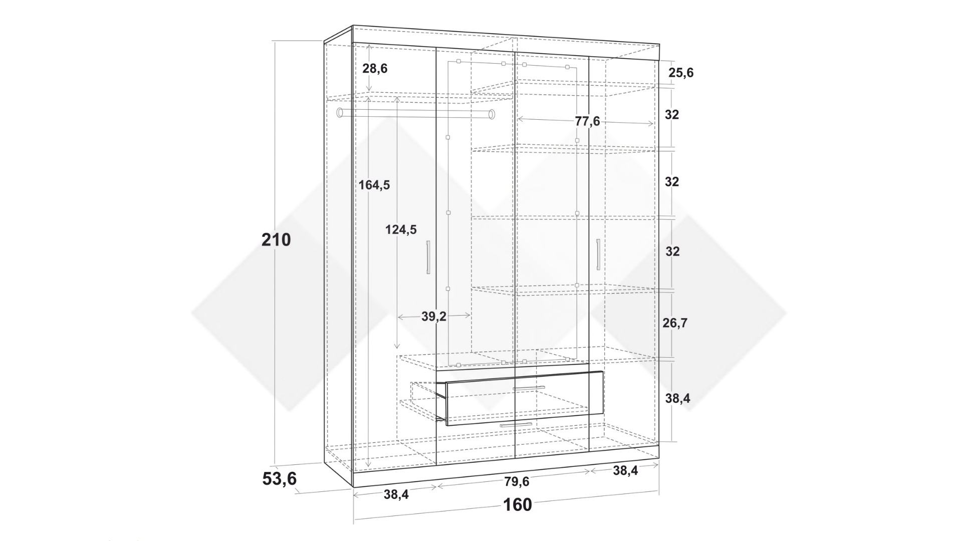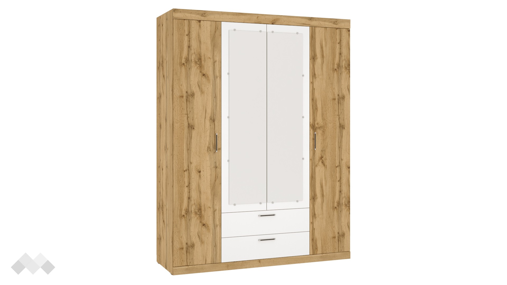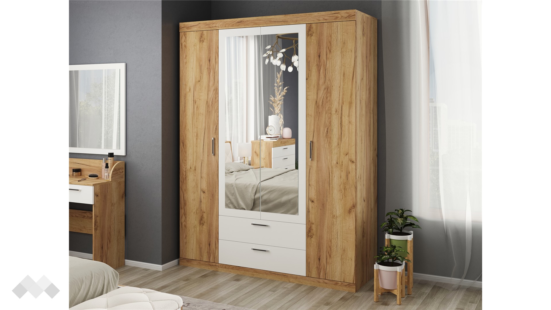 Той е четирикрилен, с 7 обемни рафта, лост за закачалки и две просторни чекмеджета. Разпределението му е практично и ти позволява да подредиш добре всички дрехи и аксесоари. Можеш да използваш рафтовете за съхранение на сгънати дрехи, по-обемни пуловери, завивки или други вещи. На лоста да закачиш всичко, което искаш да бъде готово за обличане, а в чекмеджетата да организираш бельо или аксесоари. Огледалото към този стилен гардероб ще е твой верен помощник, за да огледаш добре своята завършена визия за деня.