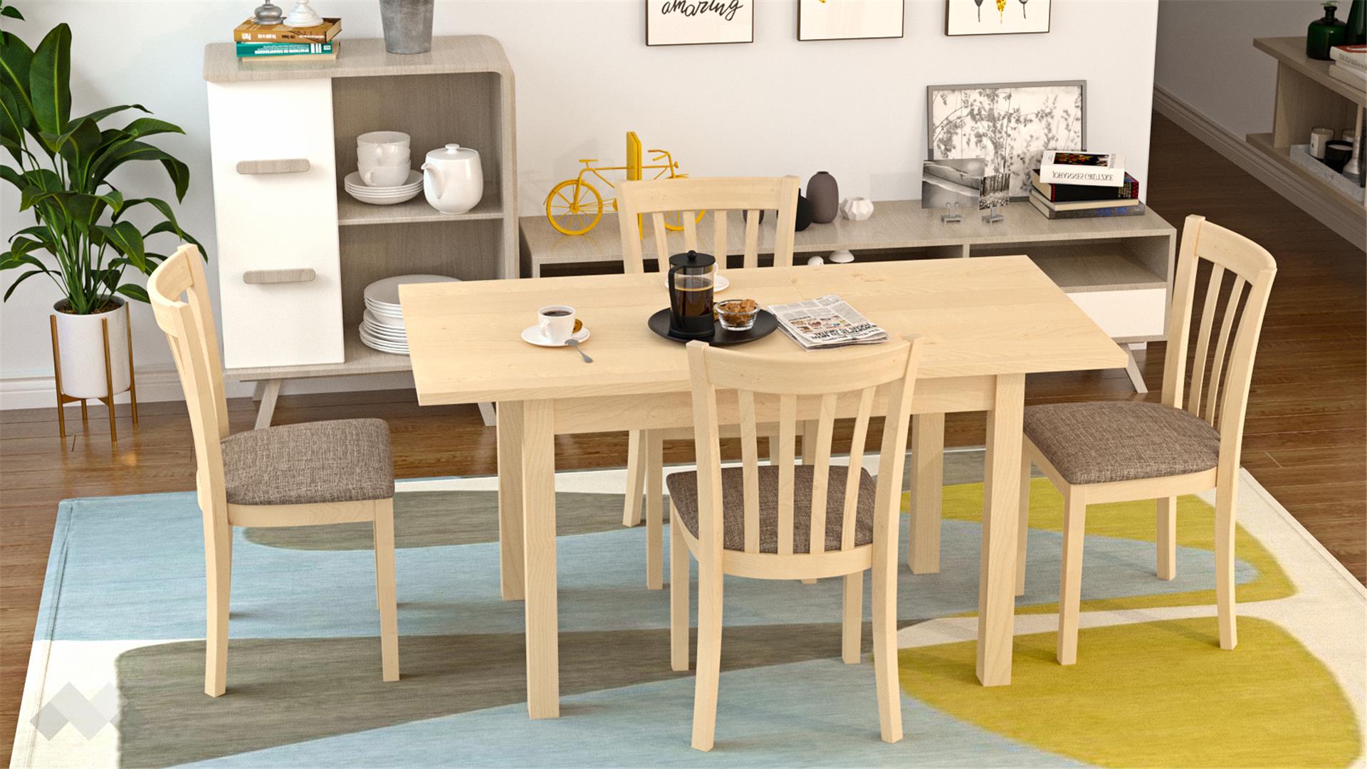 Трапезен комплект Нати М разполага с маса с дължина 110 см и 4 стола. Комплектът е изработен от масивна дървесина. А когато се нуждаеш от повече място, масата се разтяга до 138 см. Столовете са също толкова здрави и стабилни. Седалната част е достатъчно мека, за да ти е комфортно и в същото време удобно за хранене.