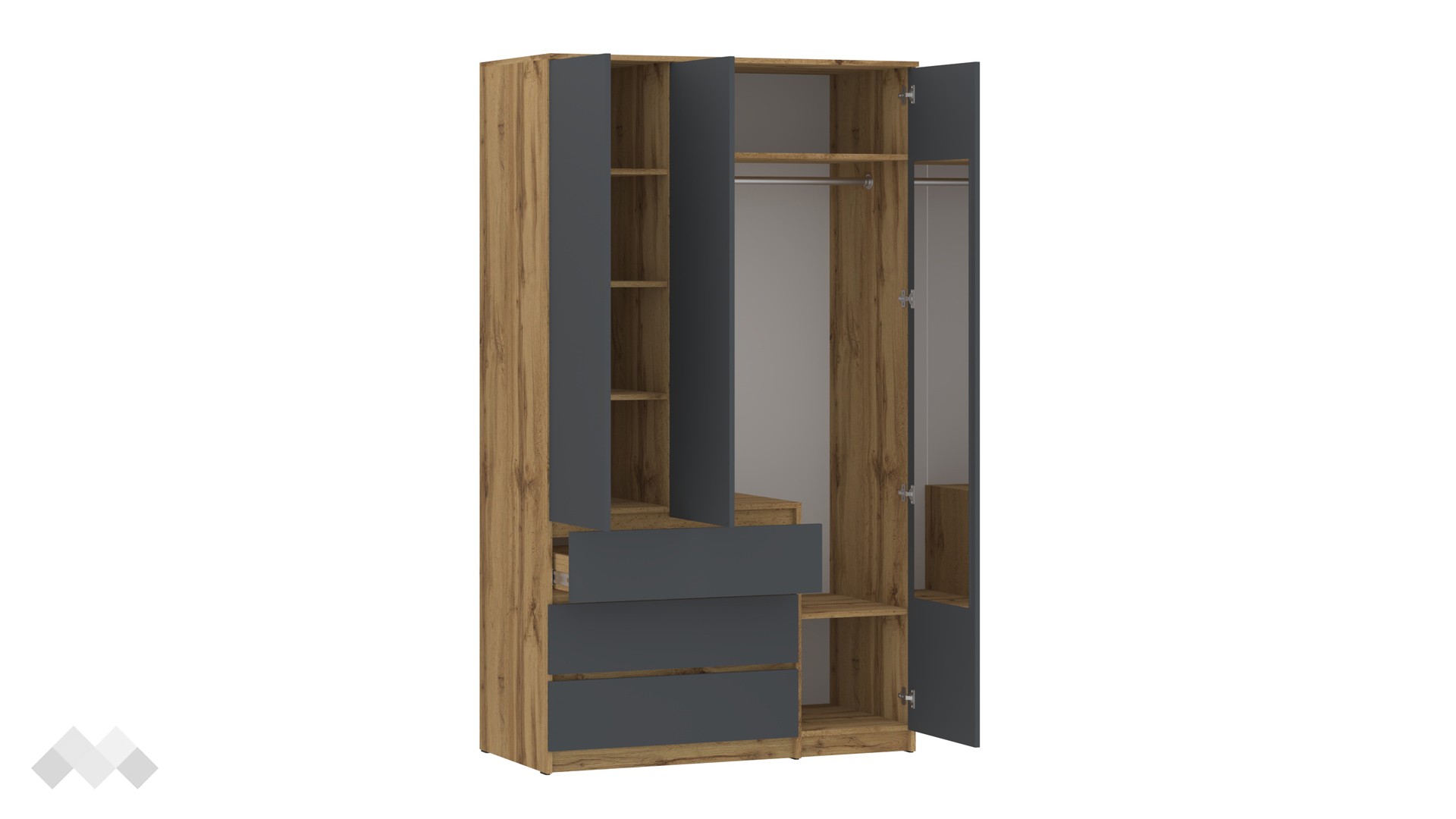 ⭐ Предимства: ✓ трикрилен ✓ 3 чекмеджета ✓ лост за закачалки ✓ телескопични водачи ✓ модерен декор ✓ практично разпределение ✓ качествена изработка ✓ 16 мм ПДЧ