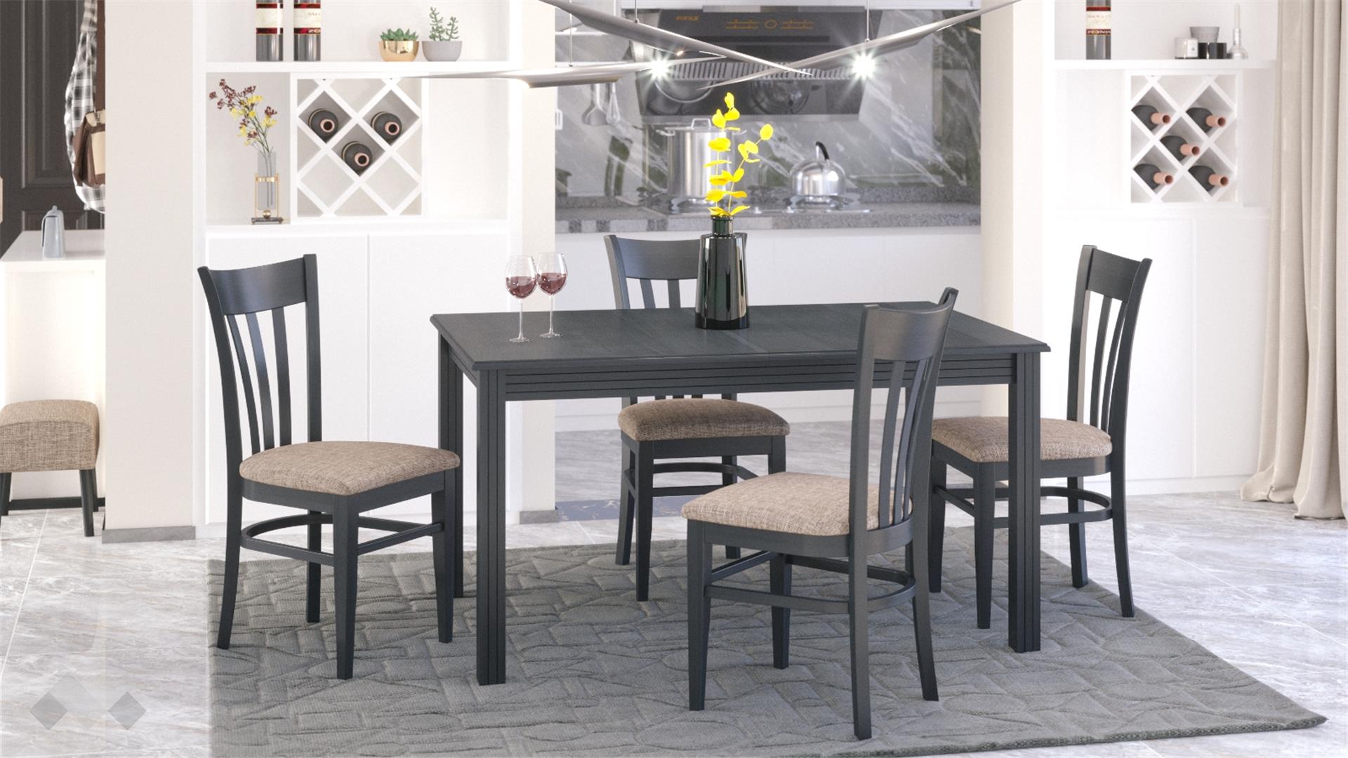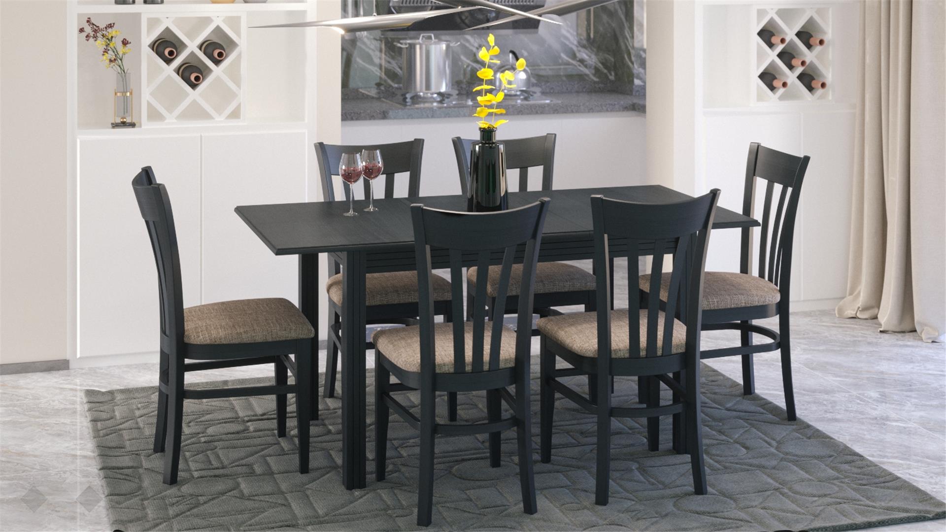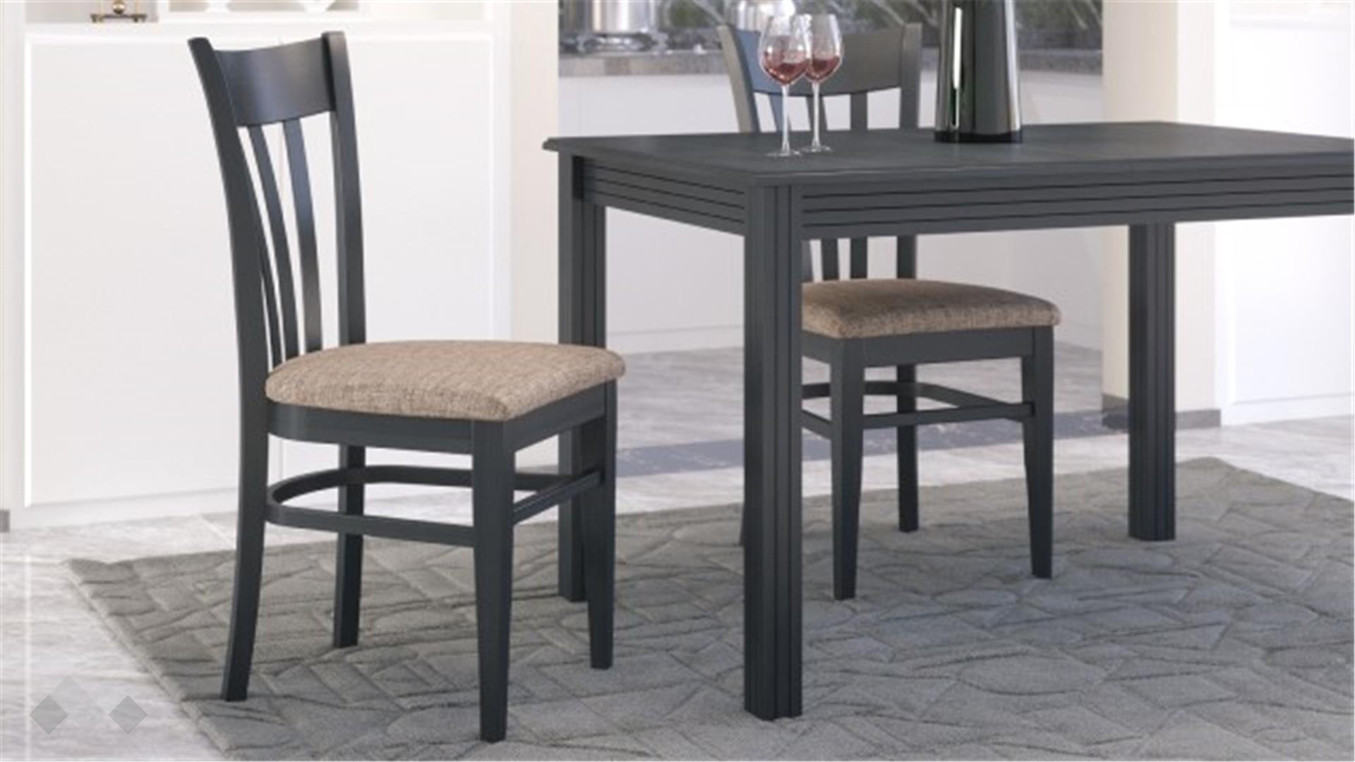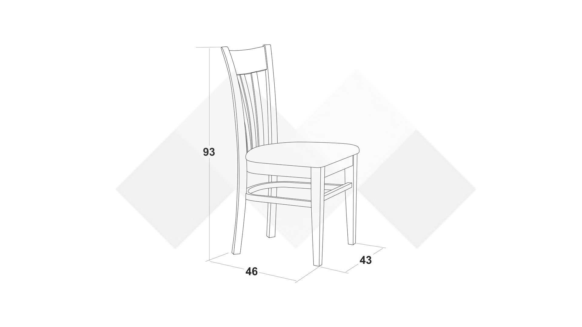 Столът е със здрава конструкция от естествена букова дървесина за устойчивост и стабилност, а лаковото покритие добавя елегантност. Седалката е проектирана с твърда основа, тапицирана с дунапрен за повече комфорт при седене и завършен със здрава текстилна дамаска, лесна за поддръжка.