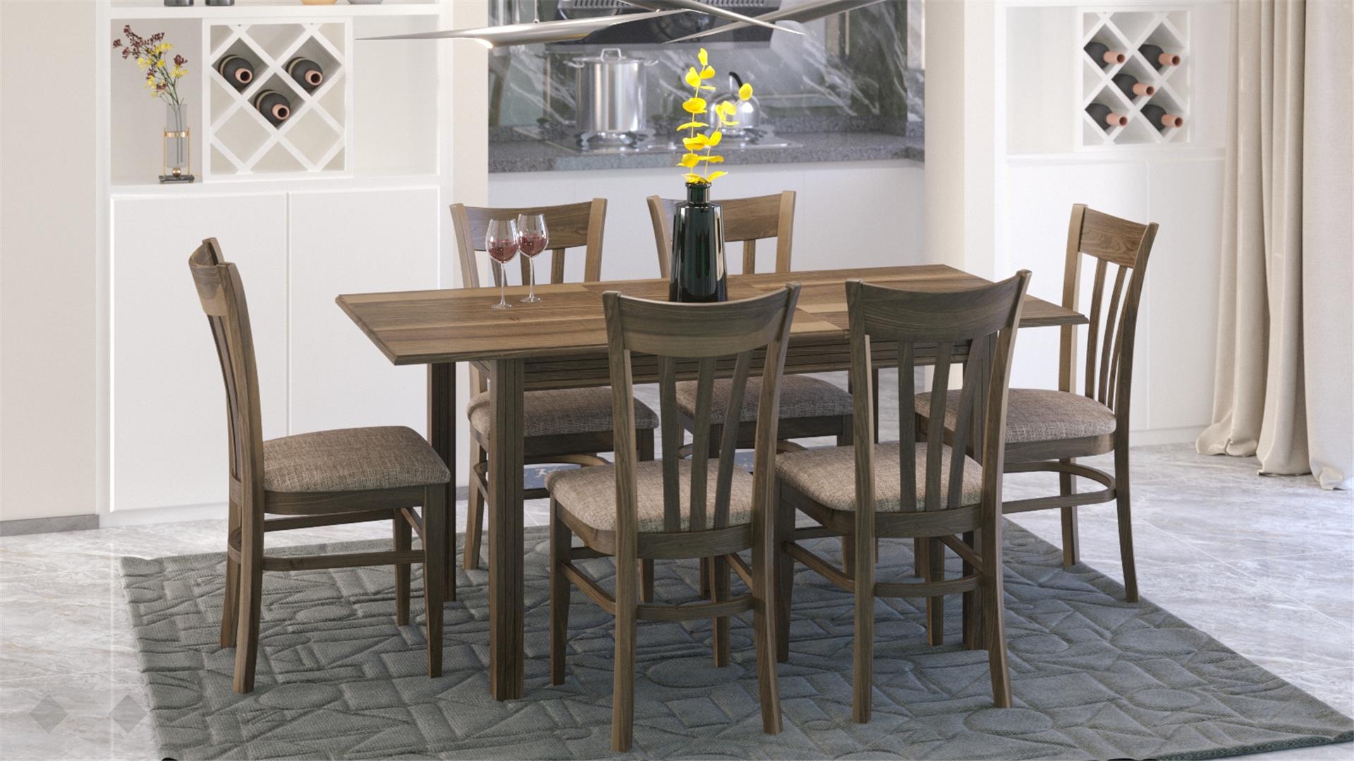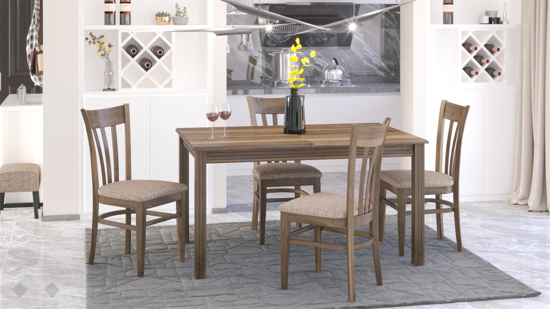 Столът е със здрава конструкция от естествена букова дървесина за устойчивост и стабилност, а лаковото покритие добавя елегантност. Седалката е проектирана с твърда основа, тапицирана с дунапрен за повече комфорт при седене и завършен със здрава текстилна дамаска, лесна за поддръжка.