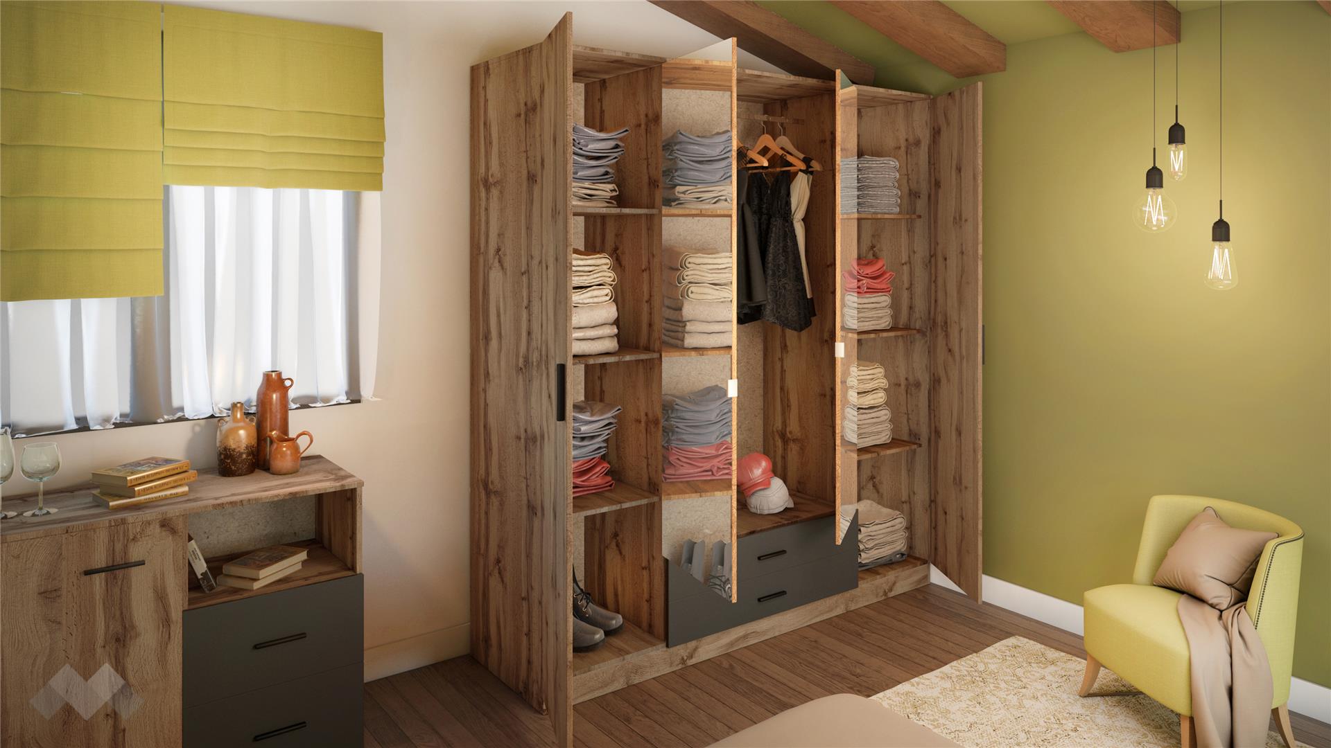 Гардеробът ще те изненада с впечатляващ вътрешен обем и отлично разпределение, в него с лекота ще организираш и подредиш всичките си дрехи. В центъра са разположени лост за закачалки и две чекмеджета, удобни за съхранение на бельо, чорапи, аксесоари или по-фини дрехи. Страничните крила са разделени на общо шест широки рафта. Това, което ще ти допадне най-много, е голямото огледало на гардероба, което е неотменен помощник в избора на тоалет всеки ден и освен това прави спалнята по-светла.