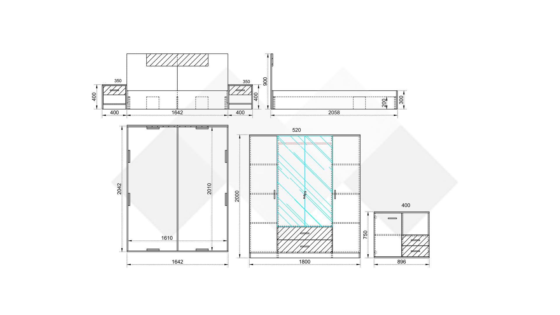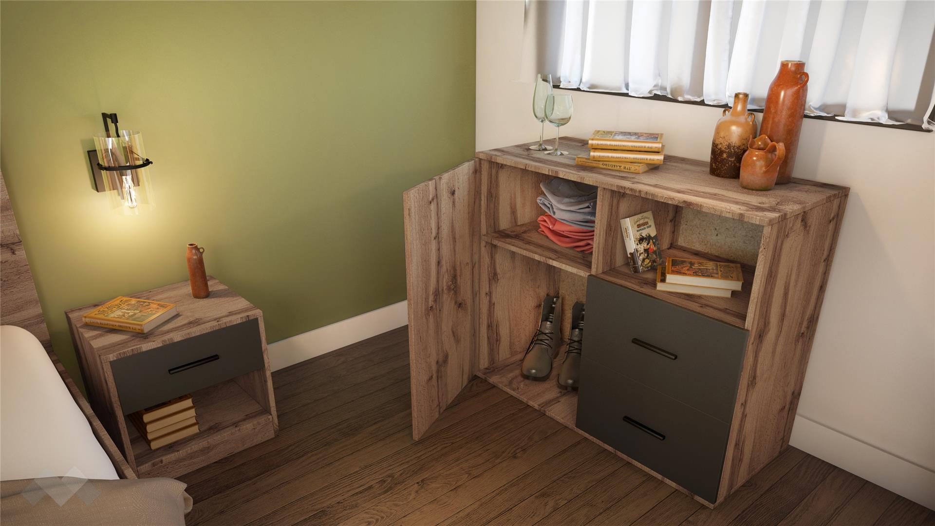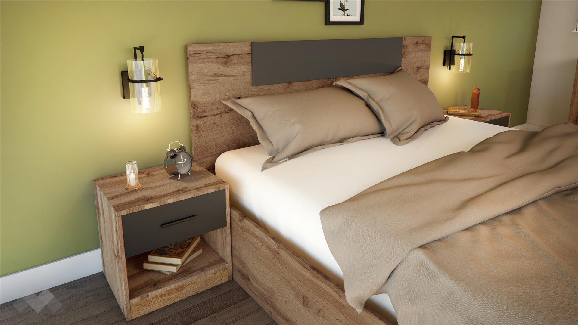 Спалнята е достатъчно голяма, за да ти предостави нужното пространство и комфорт на спане. Таблата е ефектно декорирана с акцент в цвят графит. Двете нощни шкафчета са перфектното място за кокетна нощна лампа, любимата книга, фотография или където да поставиш мобилния, за да е винаги под ръка, когато ти потрябва. Разполагаш с едно чекмедже и още един отворен рафт под него.