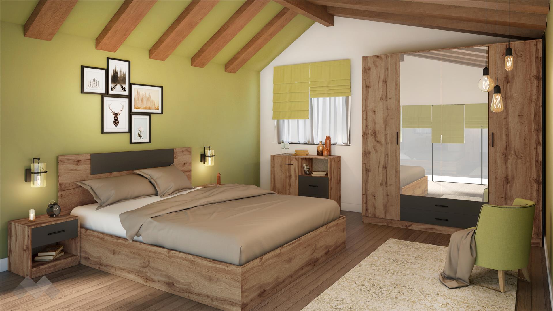 Спален комплект Олга е изпълнен в модерни декори. Топлият дъб дакота внася усещане за топлина и уют, а акцентът в цвят графит придава модерно звучене на дизайна на мебелите.