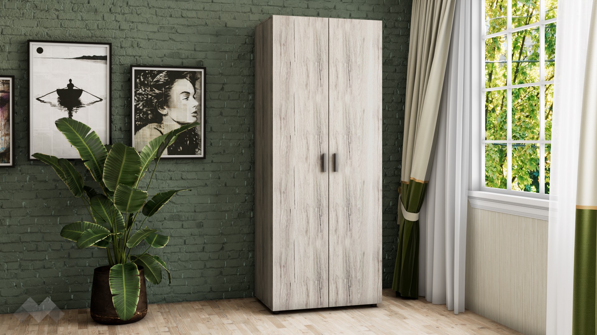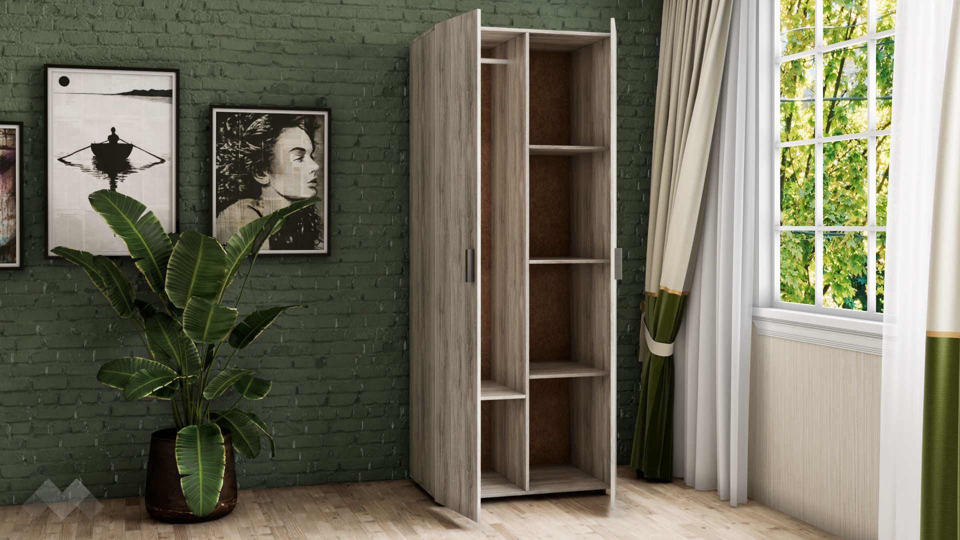 Гардероб Оптима ще ви впечатли с неутралния си декор, създаващ усещане за естествени дървесни нишки във винтидж стил. Съчетава се добре както с цветове в сивата, така и с цветове в кафявата гама. Има практично разпределение, което ви позволява да подредите добре всички дрехи и аксесоари. Той е двукрилен, с 4 обемни рафта и лост за закачалки. Можете да използвате рафтовете за съхранение на сгънати дрехи, по-обемни пуловери, завивки или други вещи, а на лоста да закачите всичко, което искате да бъде готово за обличане.