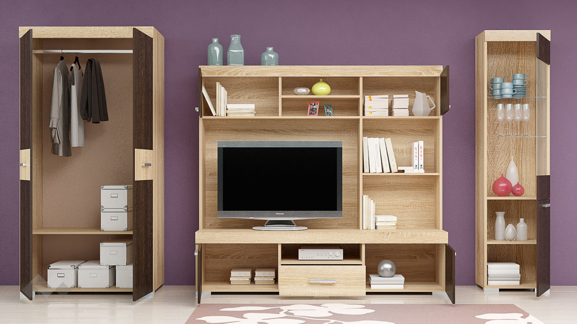 ⭐ Предимства: ✓ множество отворени и затворени пространства ✓ голямо и функционално място за съхранение ✓ ТВ шкаф ✓ висок шкаф с витрина ✓ двукрилен гардероб ✓ механизъм за плавно затваряне ✓ качествена изработка ✓ 16 мм ПДЧ