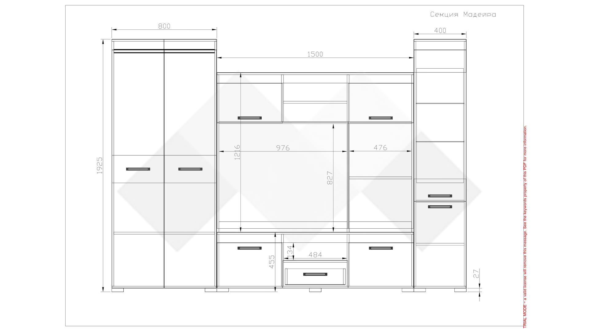 ТВ шкафът се състои от два шкафа с вратички, отворена ниша и чекмедже. Там ще откриеш достатъчно място за цялата си съпътстваща техника като ТВ приемници, DVD плейъри или други. До мястото за телевизор са разположени две отворени ниши, подходящи за всички неща, които искаш да бъдат видими за твоите гости. В горната част на секцията разполагаш с още две отворени ниши и два шкафа с вратички. Високият шкаф е съставен от витрина с два остъклени рафта и затворен шкаф с един рафт. Във витринната част можеш да организираш всичките си красиви сервизи и съдове, а затвореното пространство ти дава възможност да прибереш вещите, които искаш да останат скрити от погледите. Зад вратите на двукрилния гардероб се крият лост за закачалки и два рафта, където можеш да организираш дрехите, за които все не ти достига място в гардероба в спалнята.