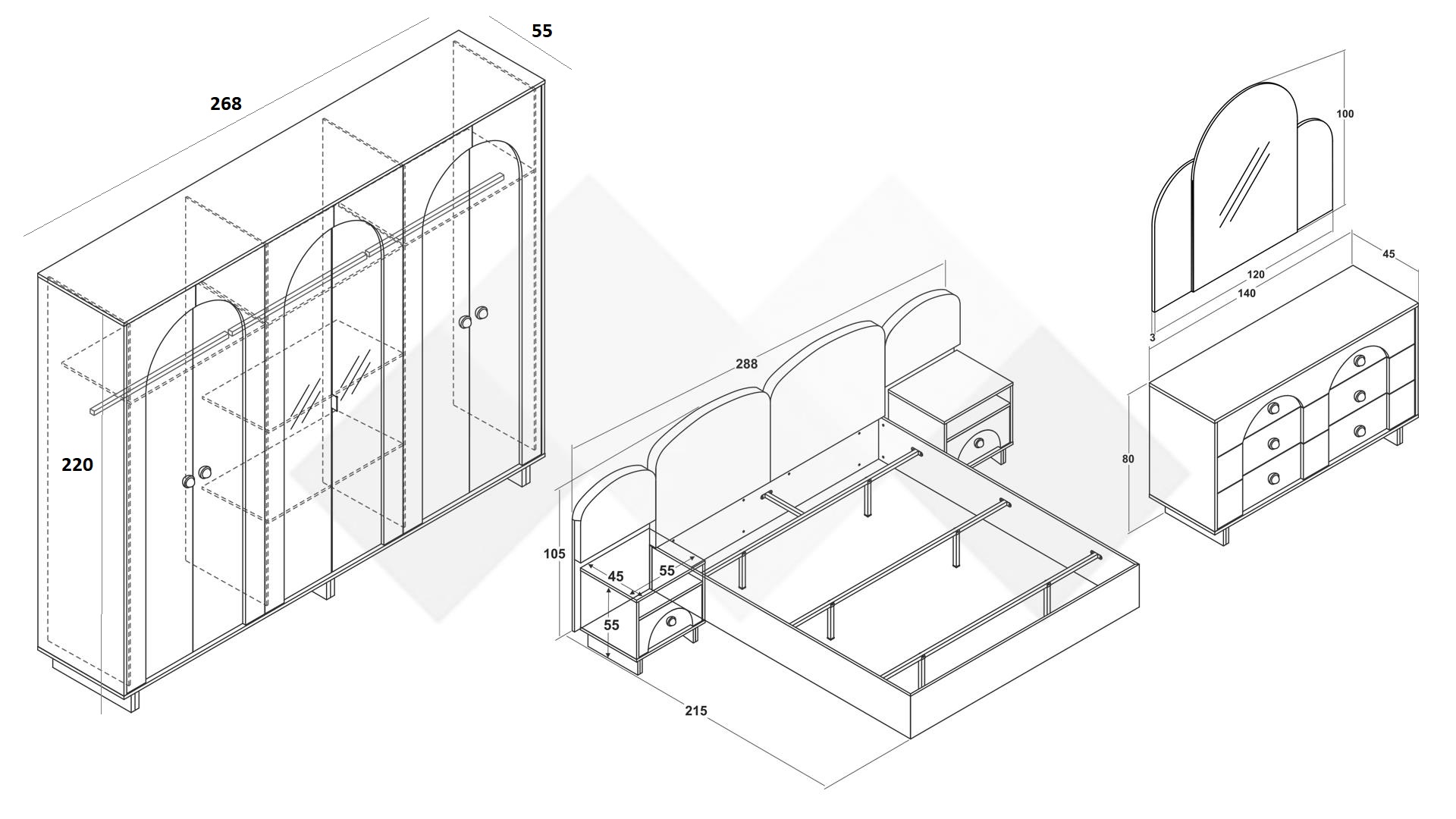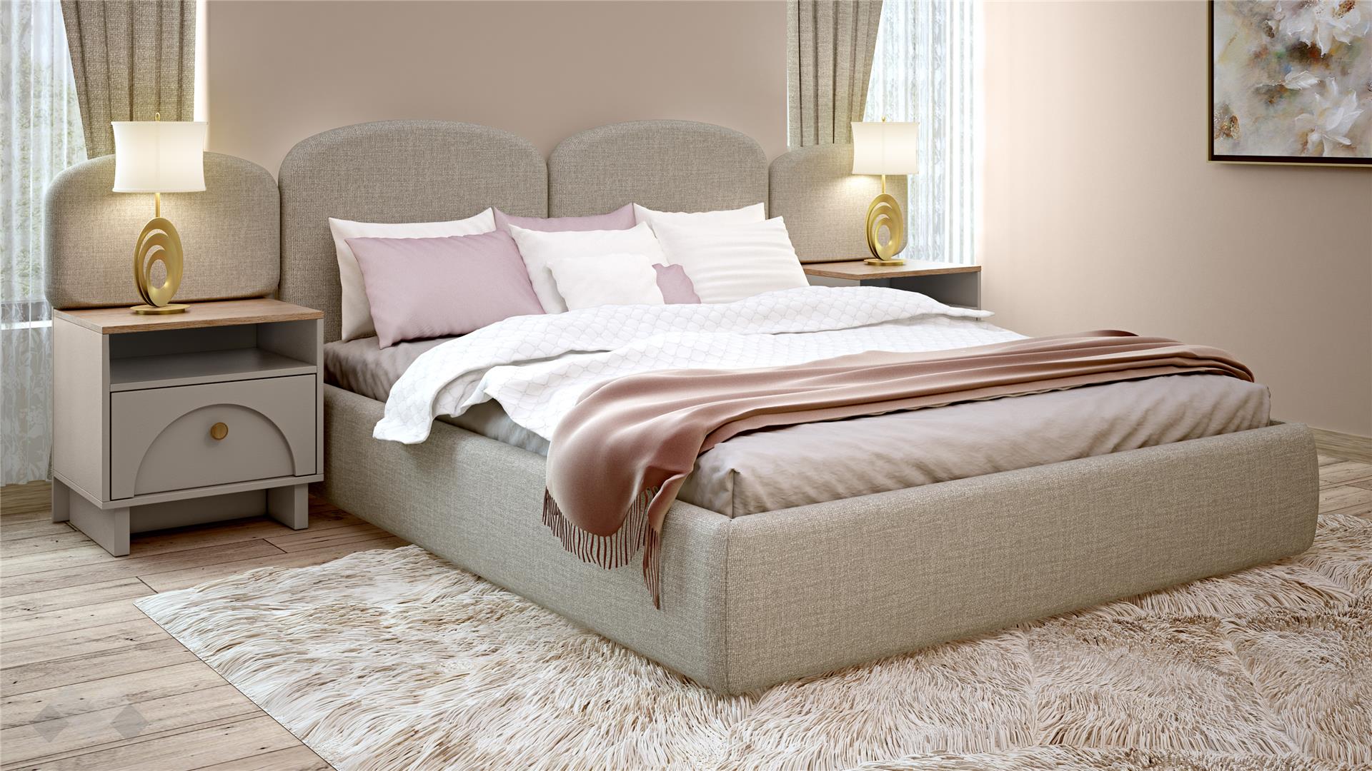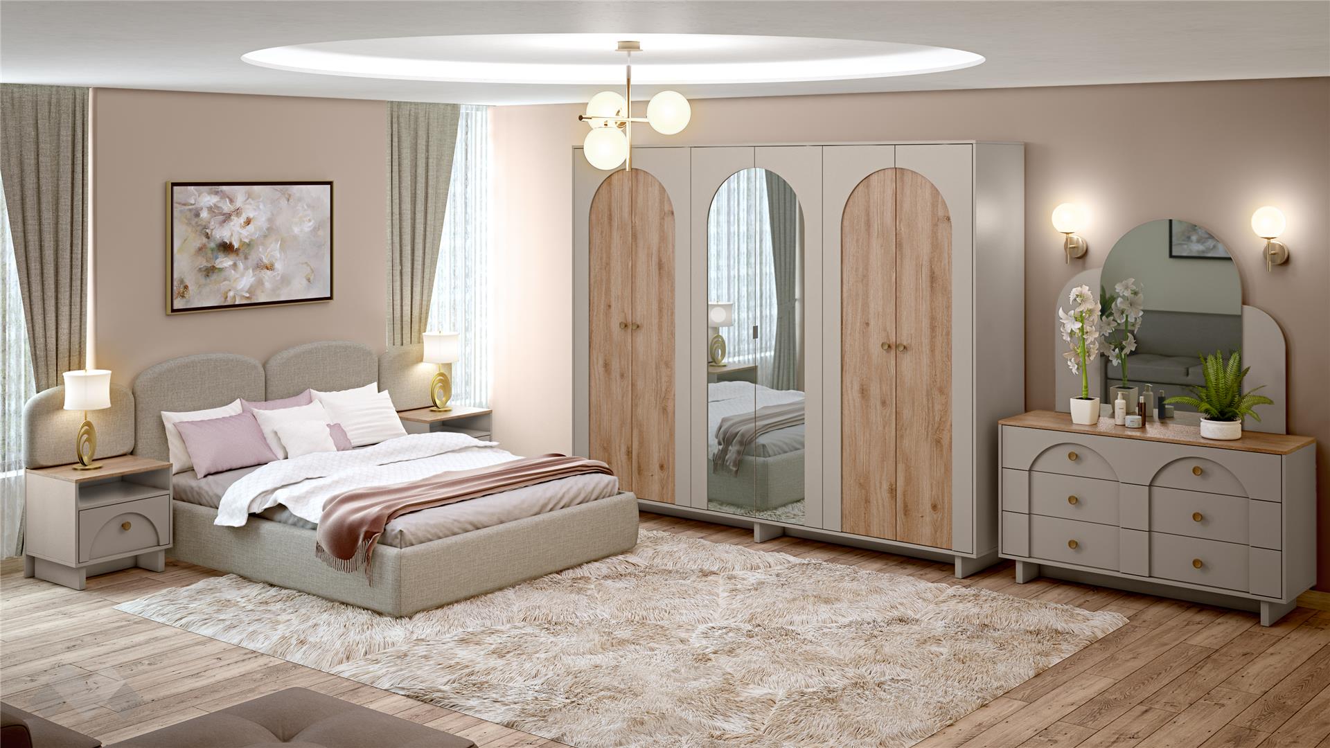 ✓ 18 мм ПДЧ ✓ тапицирана спалня ✓ мека тапицирана табла ✓ 2 нощни шкафа ✓ скрин с 4 чекмеджета и огледало ✓ шесткрилен гардероб ✓ врати с огледала ✓ 2 лоста за закачалки ✓ 5 рафта ✓ модерен бохемски декор ✓ модерен бохемски декор ✓ качествена изработка