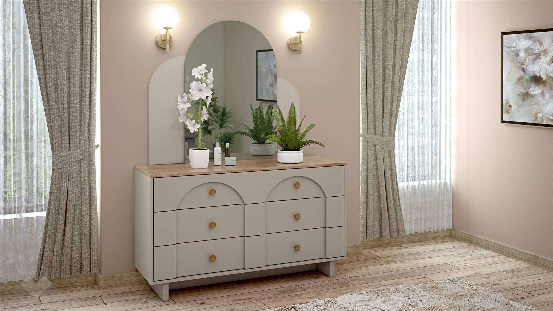 Осигури си уют у дома с бежови и дървесни тонове. Елегантната визия и модерната цветова комбинация създават хармоничен и завършен бохемски стил на спалнята. Спален комплект Рена впечатлява освен с елегантност и с изключителна функционалност.