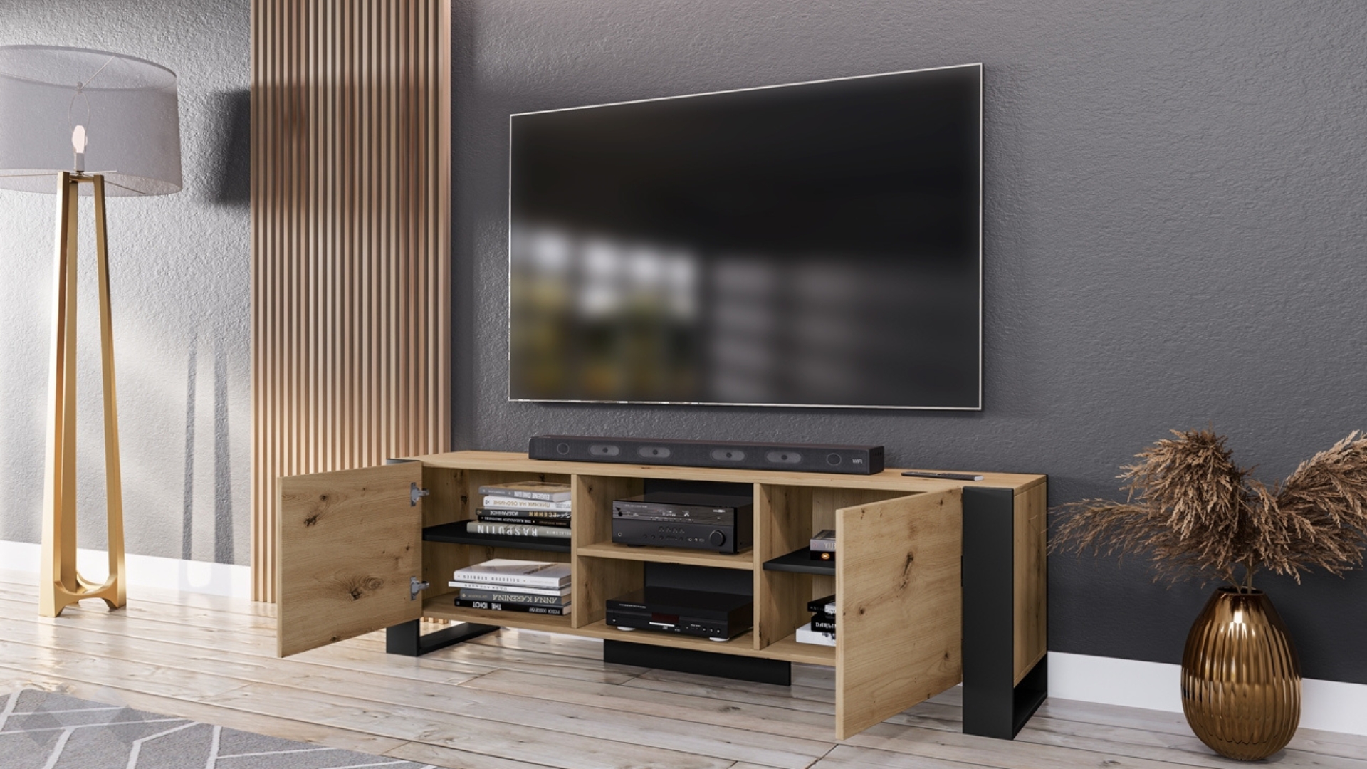 ТВ шкаф Рино е практична и модерна мебел, която разполага с 2 шкафа с вратички и 2 отворени рафта. В тях ще намериш място за цялата си съпътстваща техника, която използваш ежедневно, или тази, която използваш рядко. ТВ шкафът е на 10 см разстояние от пода, което улеснява почистването под него.
