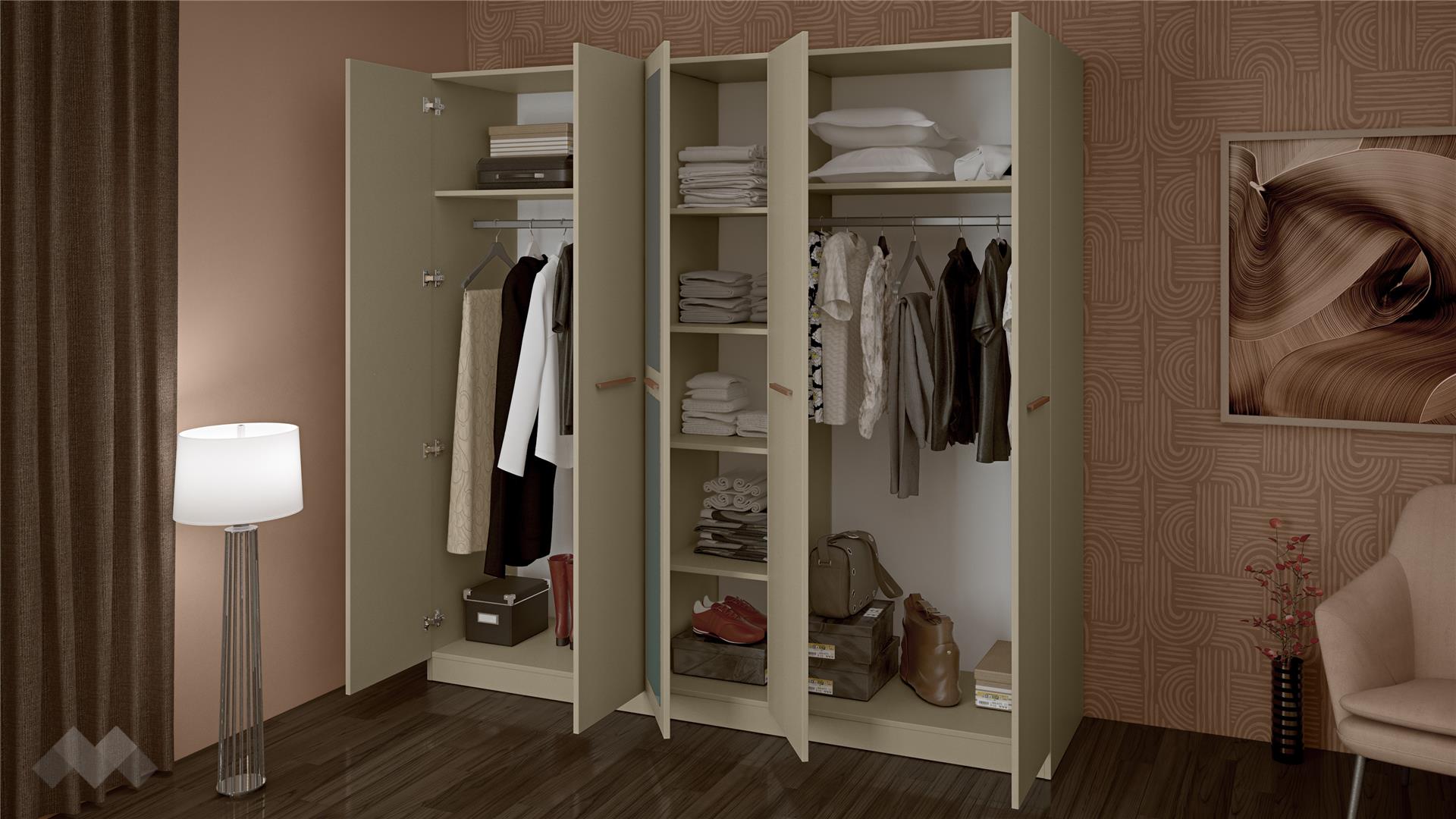 Гардеробът предлага изключително голям капацитет за съхранение, разпределен зад пет врати. Това позволява организирането на дрехи по категории, сезони или членове на семейството.