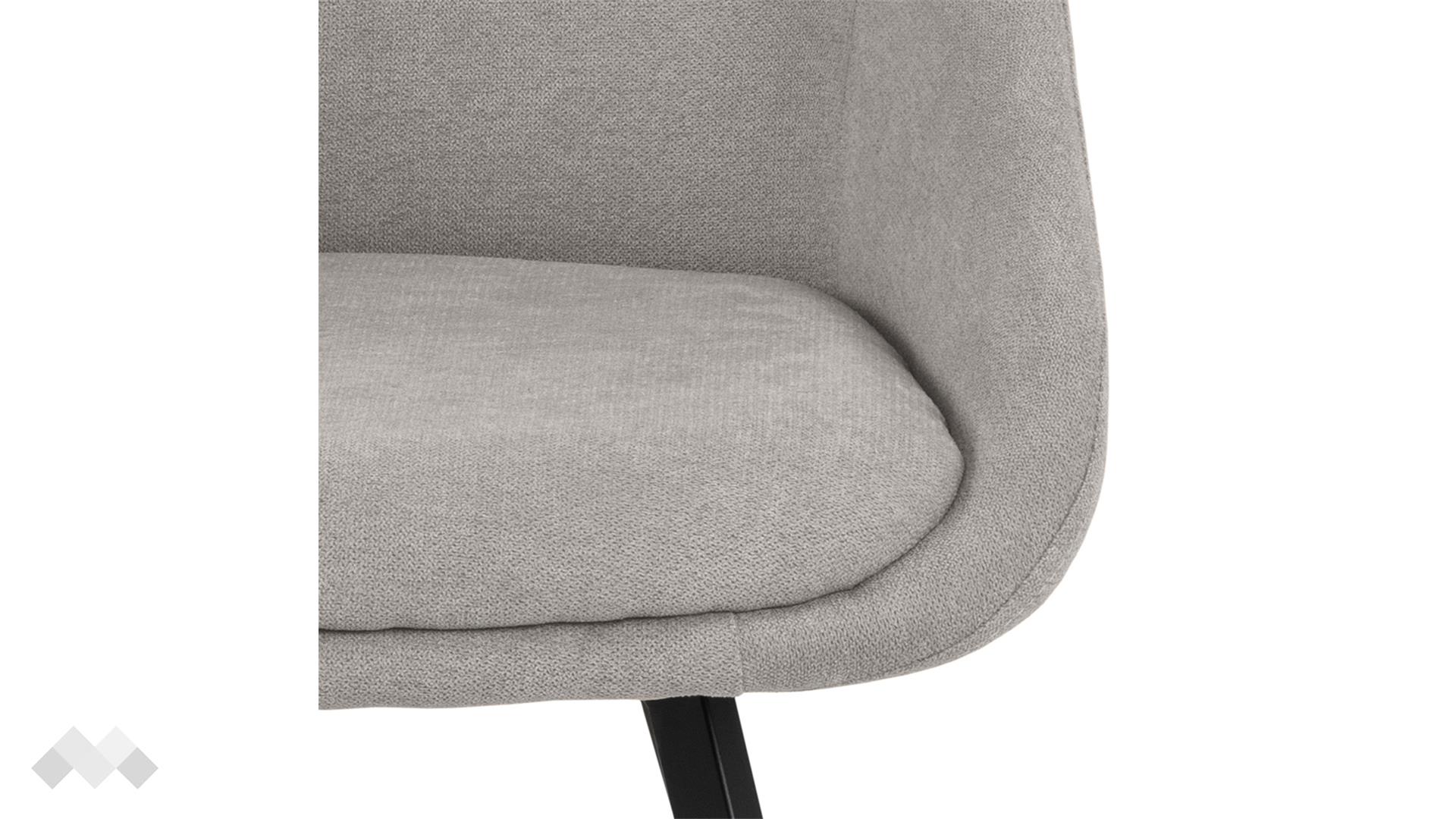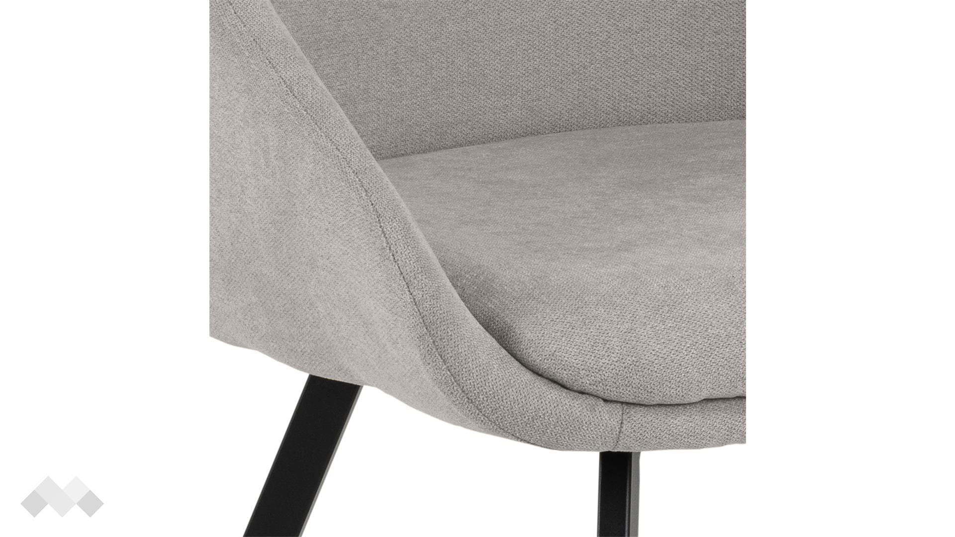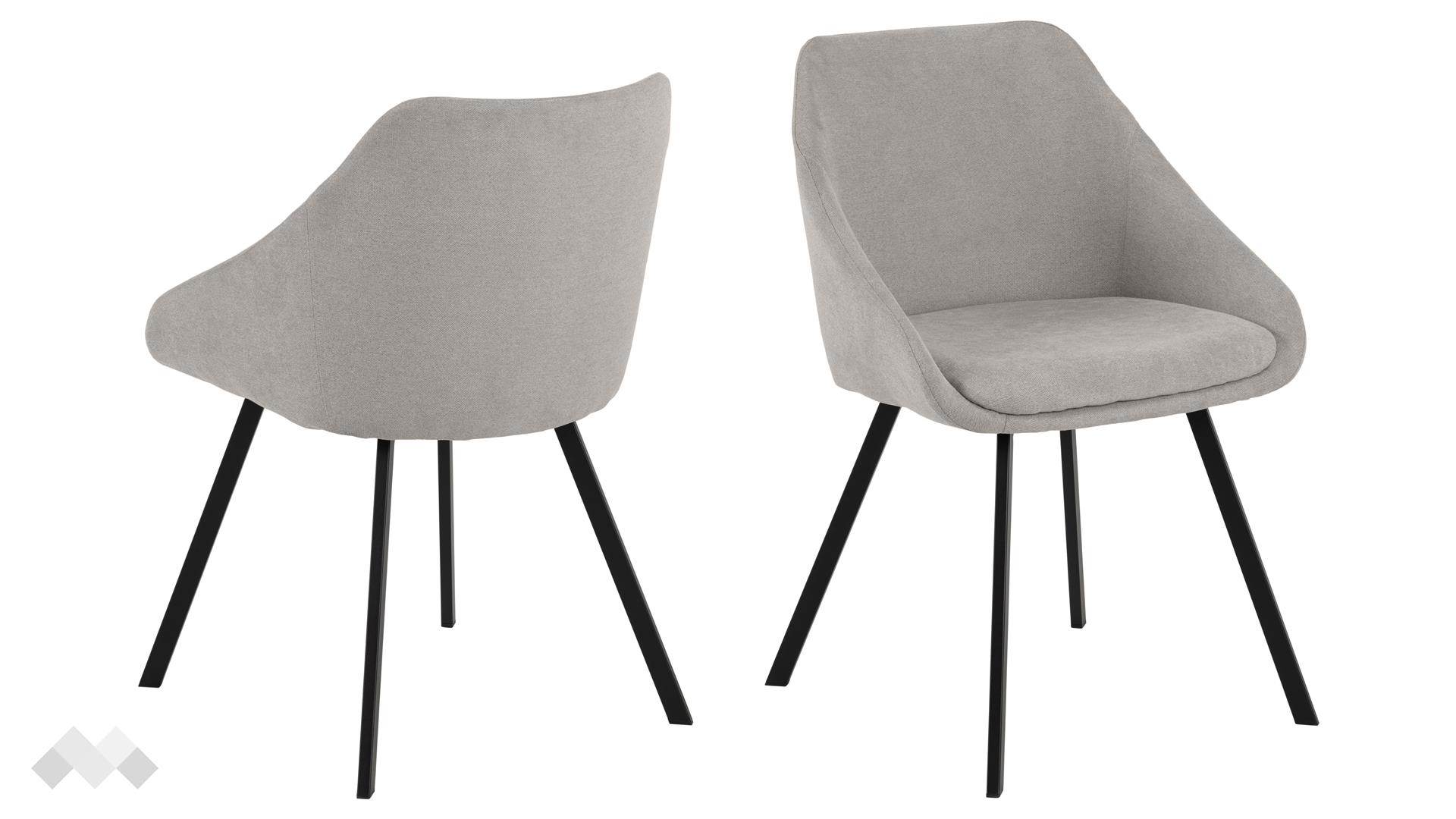 Този трапезен стол носи фокус върху скандинавския минимализъм с фините извивки на седалката си. Привлекателния външен вид на модела се подчертава от отворената предна част и омекотената седалка. Тапициран със светло сива дамаска, трапезният стол може да се съчетае с почти всеки цвят, благодарение на неутралните си характеристики. За да подчертае седалката столът стои върху матово черни метални крака.