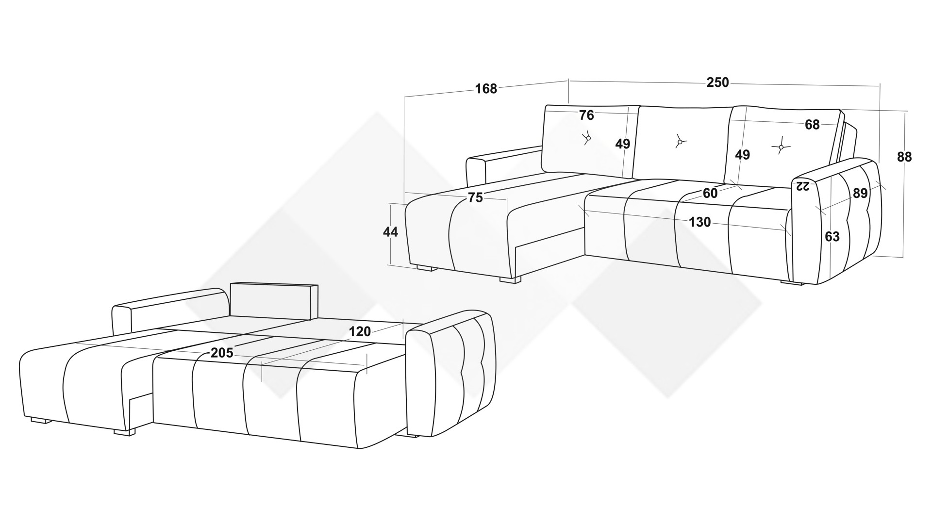 Д: 250 см Ш: 168 см В: 88 см