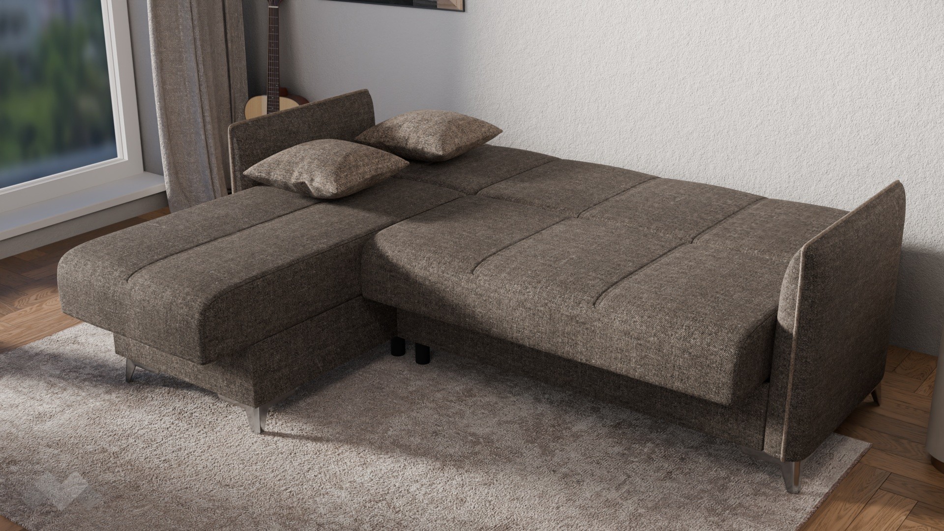Клик-клак механизмът прави използването на дивана изключително лесно – с леко движение той се превръща от удобно място за сядане в практично легло с площ за сън 200/115 см. Това го прави отличен избор както за ежедневна почивка, така и за спонтанни гости. Вградените ракли под седалната част и под лежанката осигуряват допълнително място за съхранение, където можеш да прибереш завивки, възглавници или други вещи и да поддържаш помещението подредено и организирано. Дамаската е приятна на допир, изработена от здрав и устойчив текстил.