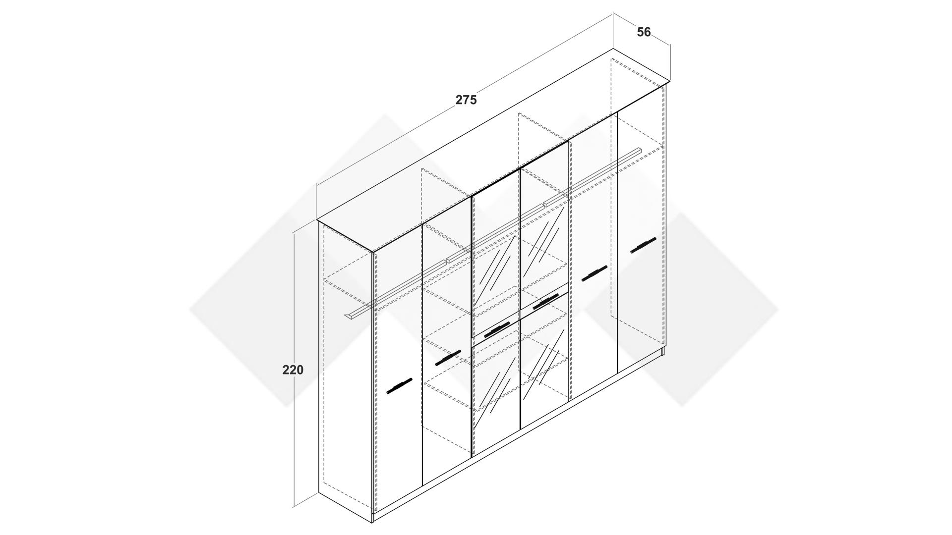 Гардеробът е просторен и функционален - с два лоста за закачалки и шест рафта, за да организираш всичките си дрехи. Двете огледални врати, освен, че служат за финален оглед на визията си, те визуално увеличават пространството и отразяват светлината в помещението. Елегантните дръжки подчертават модерния и изискан стил.